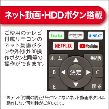 NETFLIX、Prime Video、U-NEXT、hulu、YouTubeのボタン搭載!今までお使いのネット動画ボタンがご利用いただけます。