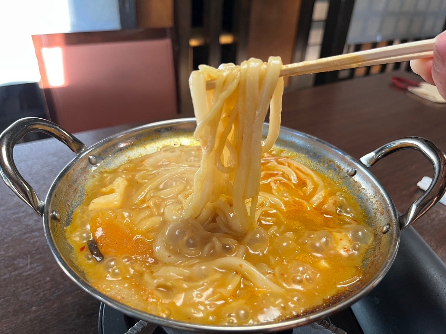 コロナ以降、免疫力を高めることを意識して開発したこの鍋は、8つの発酵素材(納豆、キムチ、チーズ、味噌、醤油、かつお、豆板醤、コチュジャン)を使用しています。さらに、きのこや野菜など合わせて9種類と多くの素材を使い、健康に配慮した食事としても喜んでいただきたいと考え、時代に合わせた新しい鍋を完成させました。鍋は、和風のかつおだしをベースに、鶏肉や鶏つくねなどを加え豆板醤やコチュジャン、味噌で味噌チゲ風に仕上げています。