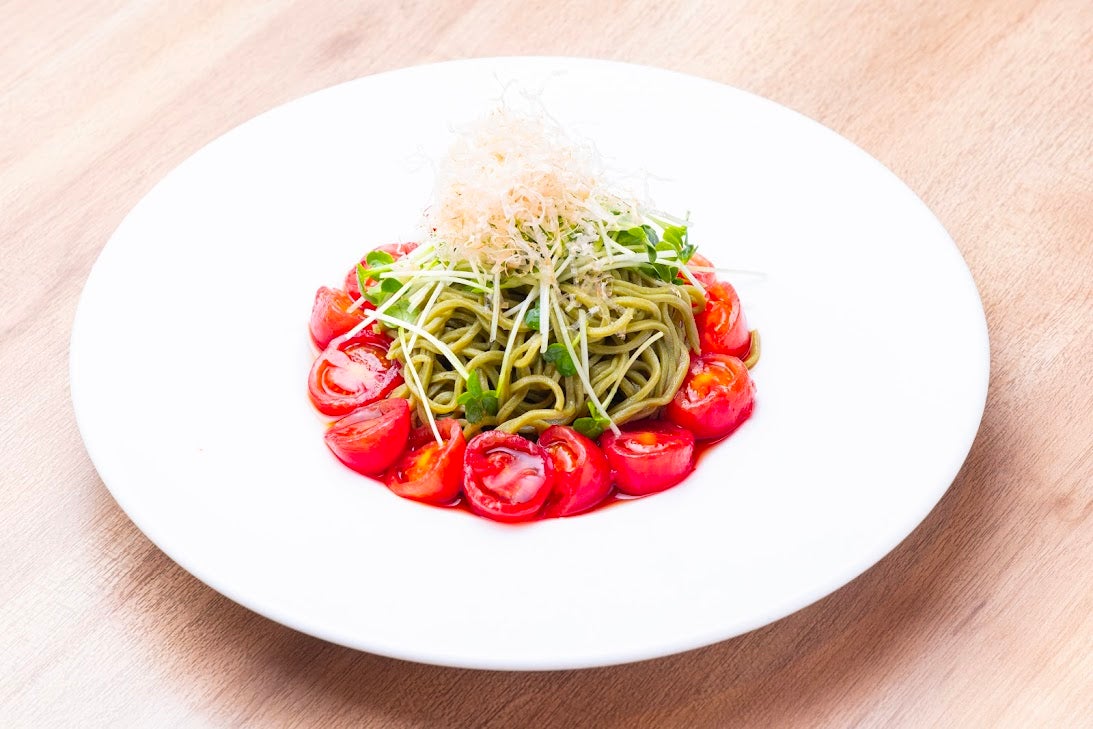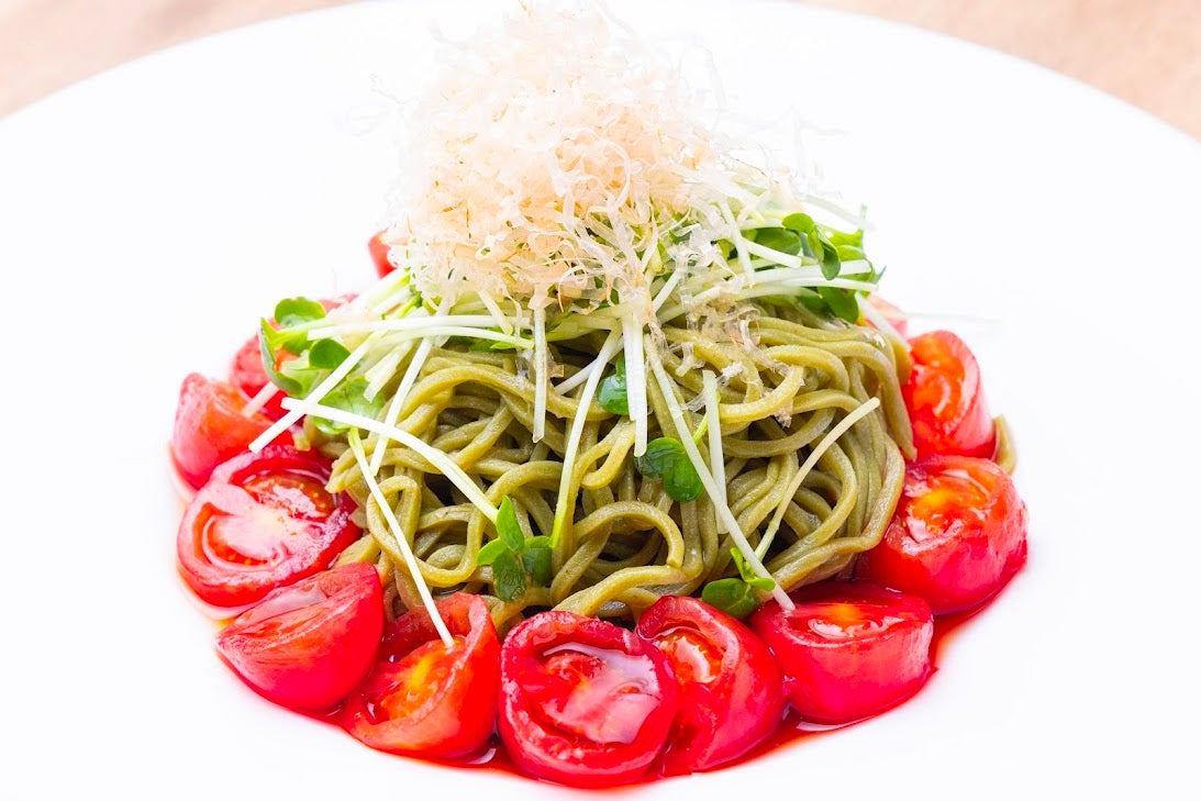 モリンガを練り込んだ蕎麦とフルーツのように甘いトマトが絶妙なハーモニーを奏でる新感覚の見た目も鮮やかなお蕎麦です。