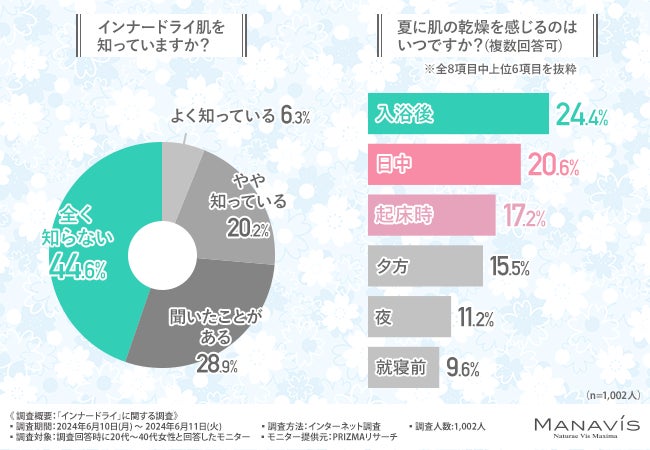 そこで今回、「マナビス 薬用レストアジェル EXc」(https://www.manavis-cosme.co.jp/product/basic/restorejel.html)を展開する株式会社マナビス化粧品は、20代~40代の女性を対象に「インナードライ」に関する調査を実施しました。