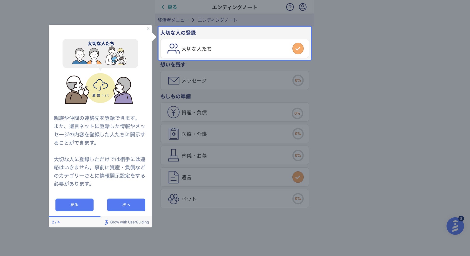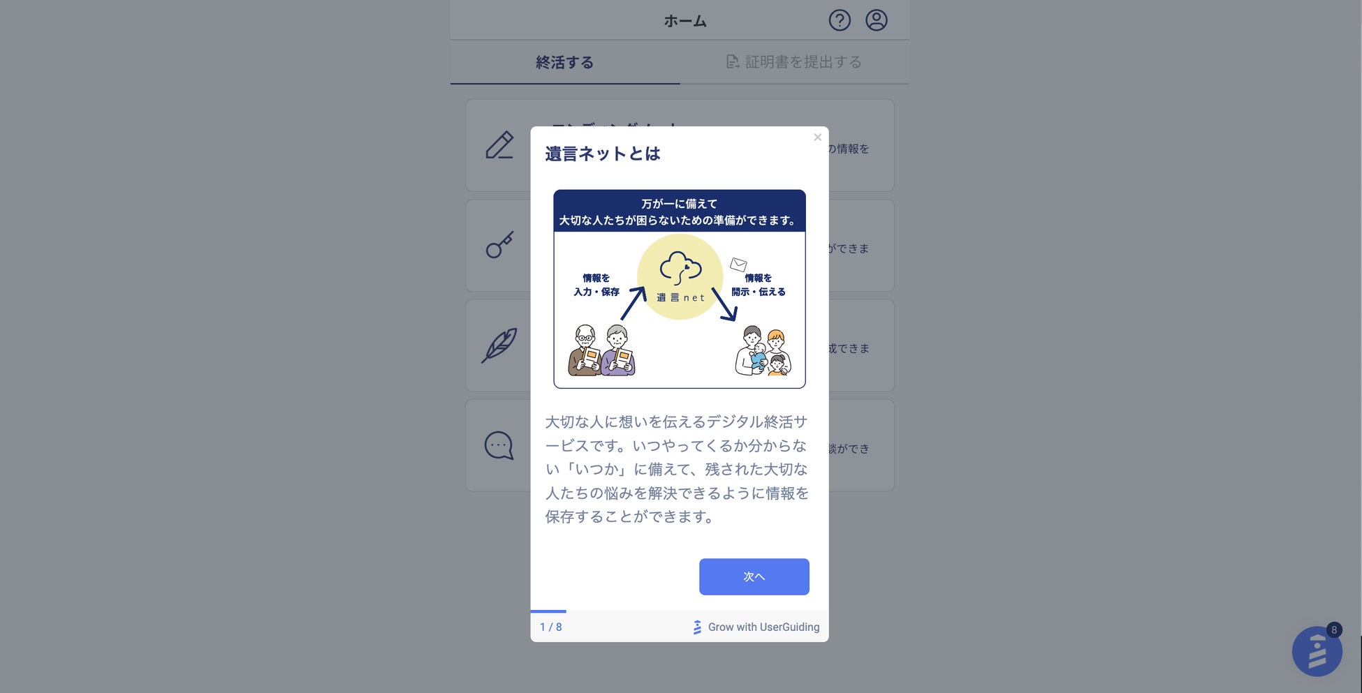 新たに追加されたユーザーガイド機能は、登録してサービスを開始する際、自動的にスタートするガイドです。遺言ネットの説明から、エンディングノートや遺言書作成の記入方法、入力した情報を大切な方に送る手順などをイラストなどでガイドします。