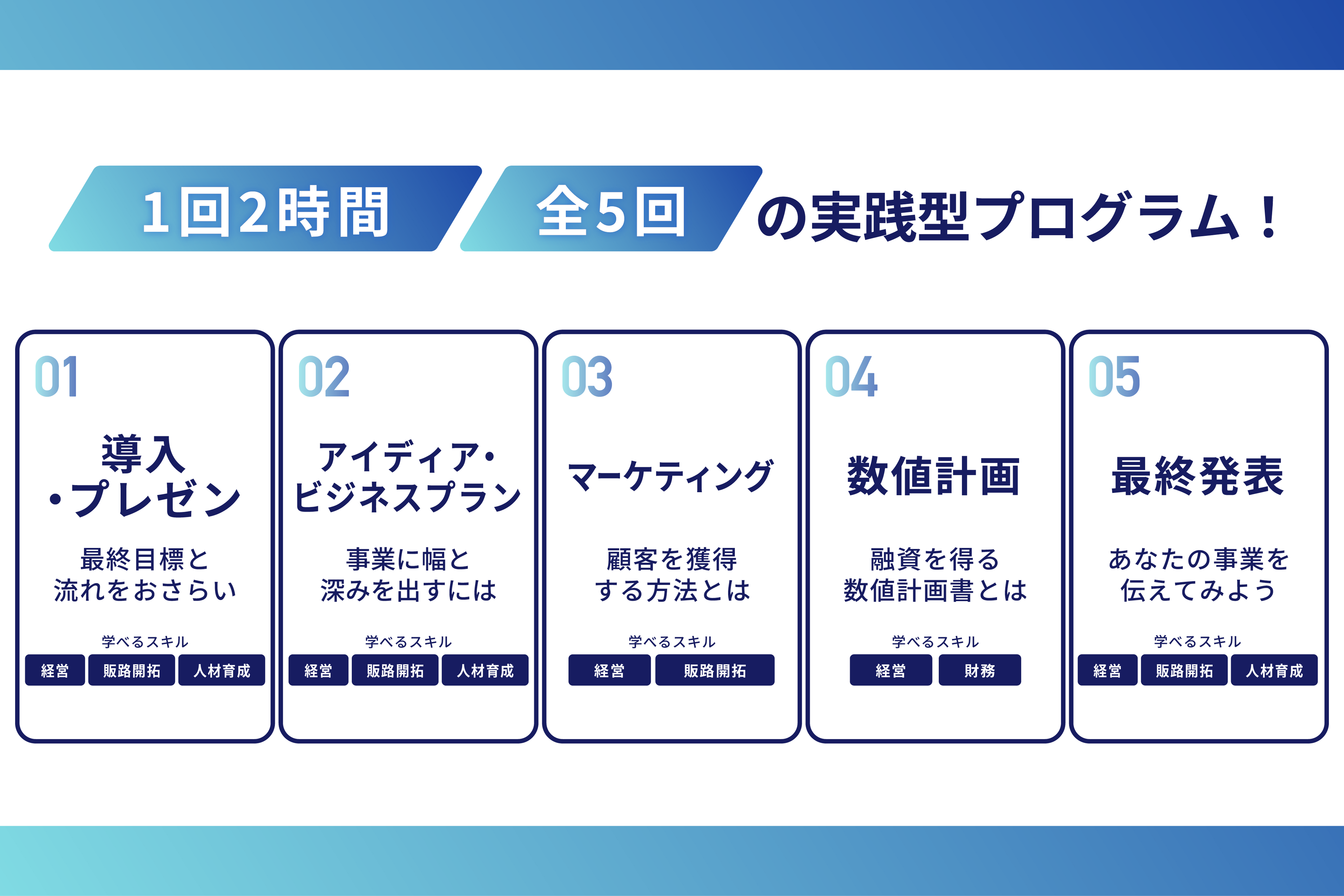 1回2時間の講座を全5回、2ヶ月間程度を使って学ぶ講座となっております。