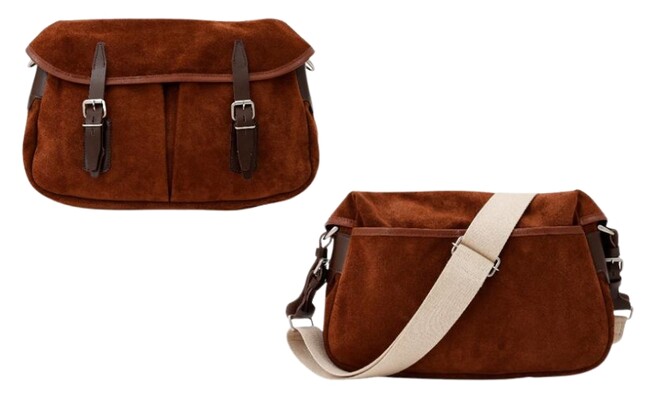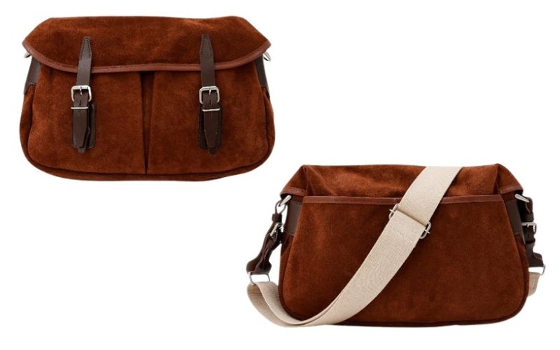 スエードを使ったハンティングタイプのショルダーバッグ。中には小物入れのポケットがあり、用途に応じて取り外し可能です。