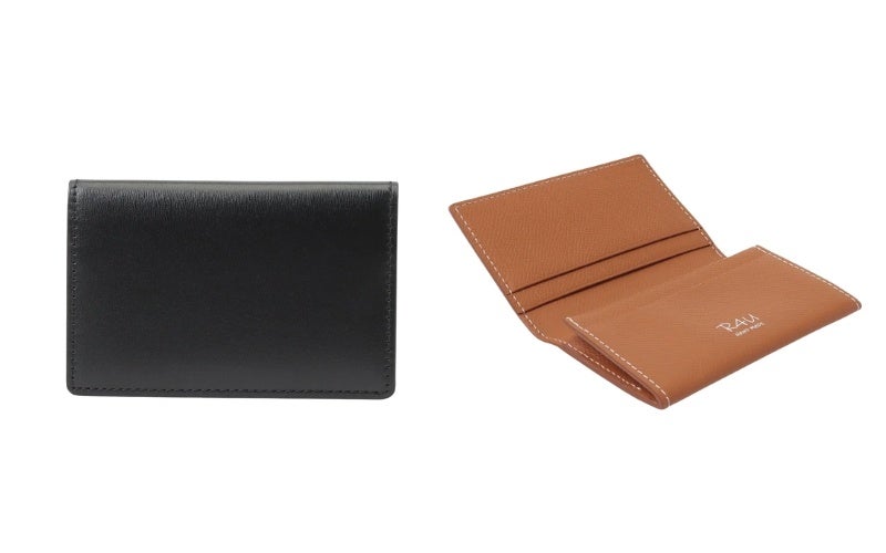 ボックスカーフの財布や、スェードシリーズなど、ブランドを象徴するアイテムが並びます。なかでも別注の角金が付いたマネークリップや名刺入れは上質さ、クラフツマンシップに加えてモダンなデザインが際立ちます。