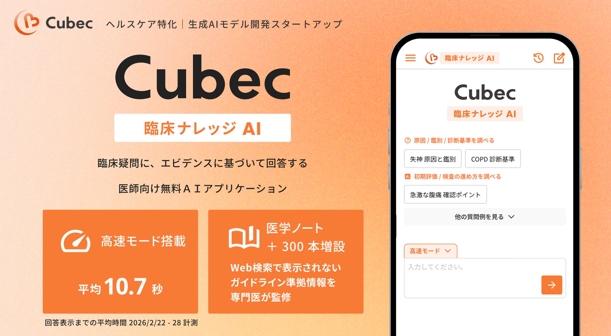 医師向け臨床ナレッジAI「Cubec」を開発する株式会社Cubec(本社:大阪府吹田市、代表取締役CEO:奥井 伸輔)は、2026年2月に「Cubec」のシステムアップデートを実施し、「高速・推論・論文」の3モードを搭載しました。また、Cubecの独自データである「Cubec医学ノート」について、約300本の大幅拡充も実装しました。多忙な医療現場において、臨床ナレッジAI「Cubec」が医師の知識探索と業務効率化に貢献できるよう、今後も改良を続けてまいります。