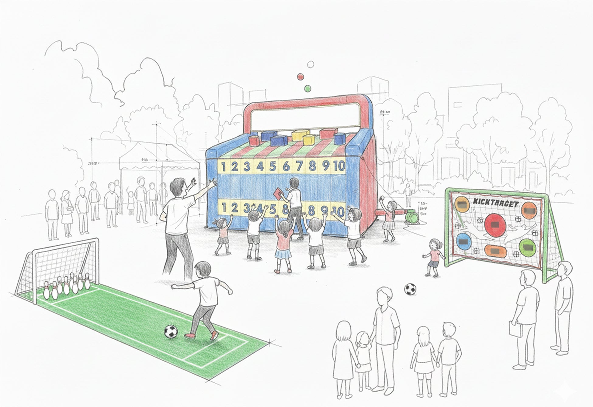 近い距離ほど高得点が狙えるサッカーボウリング。戦略的なシュートで高得点を目指しましょう。
