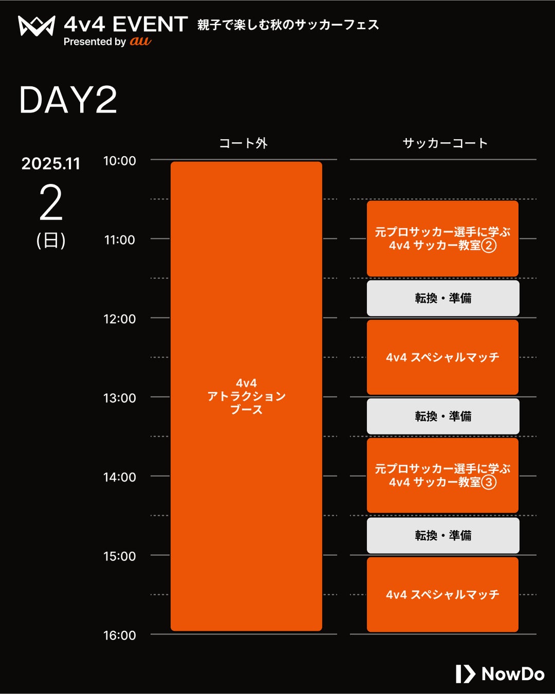 KDDI株式会社(所在地:東京都港区、代表取締役社長 CEO:松田 浩路、以下 KDDI)は、育成年代向けの4人制サッカー「4v4」を運営するNow Do株式会社(所在地:東京都新宿区、代表取締役社長:本田 圭佑)と共催し、2025年11月1日(土)・2日(日)に、たまプラーザ テラス のノースプラザ(東急百貨店 たまプラーザ店) 3階 庭園 COMMON FIELD(神奈川県横浜市青葉区美しが丘一丁目7番地 )にて、小学生とその親世代を対象とした「4v4 EVENT Presented by au 親子で楽しむ秋のサッカーフェス」(以下、本イベント)を開催します。本イベントは、本田圭佑が考案した新しい4人制サッカー「4v4」を親子で気軽に体験できる、週末のおでかけにぴったりのイベントです。