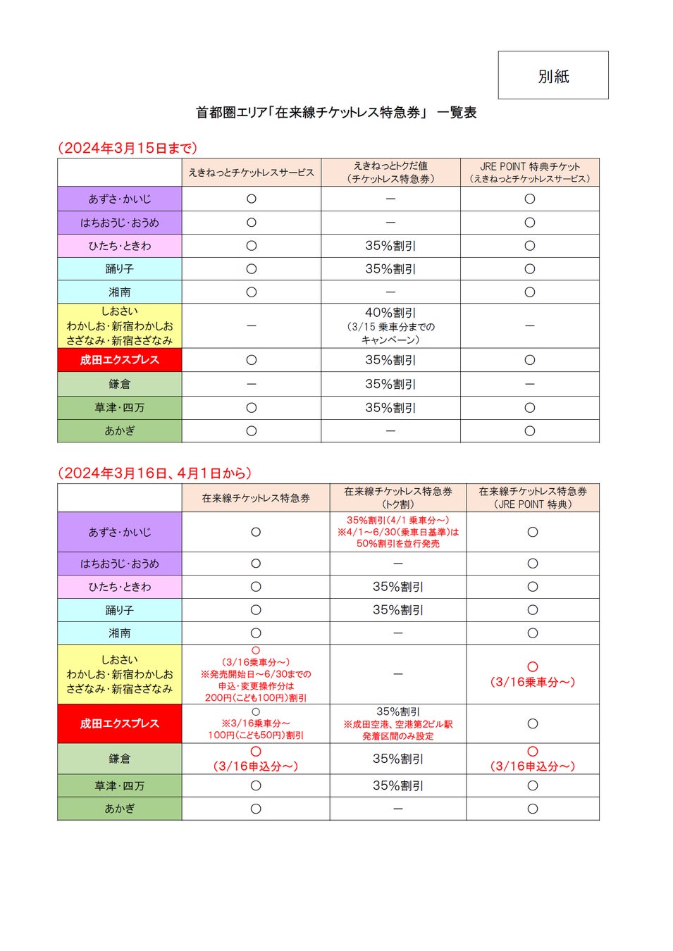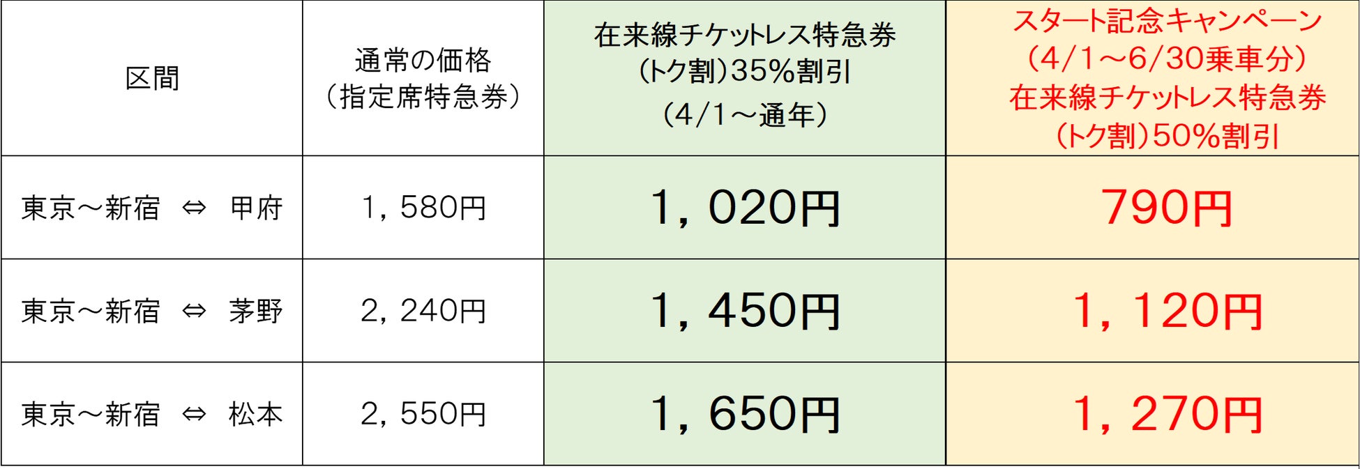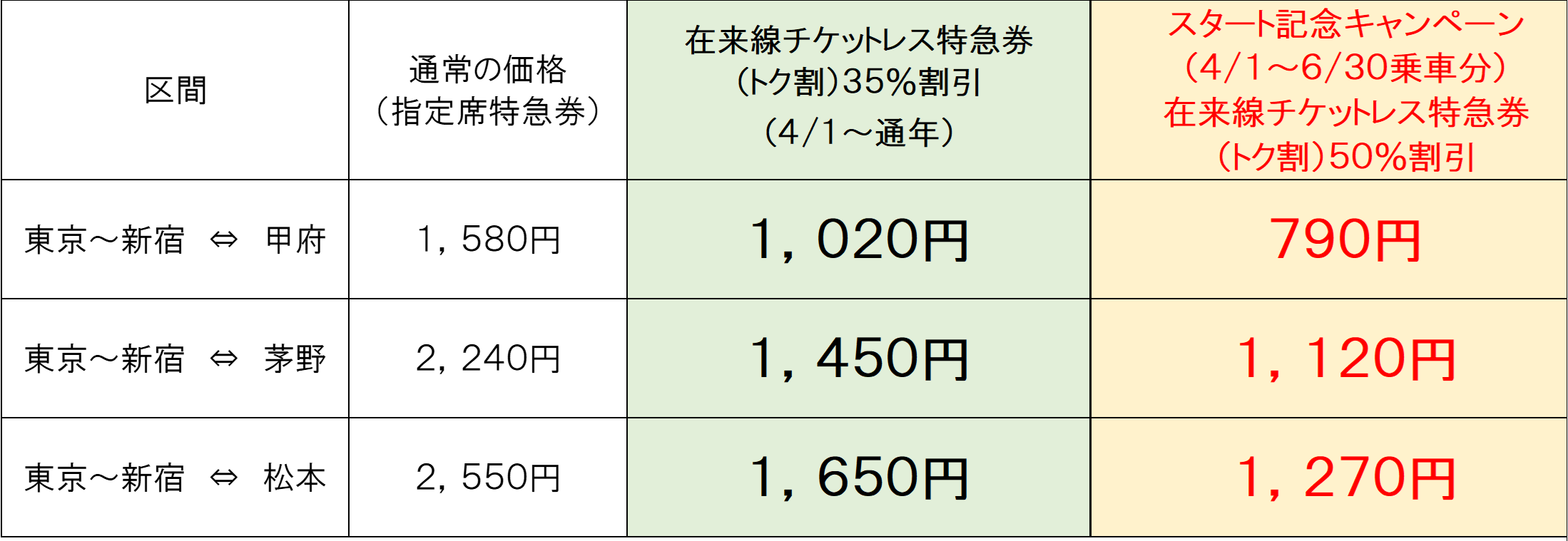 〇中央線特急では「在来線チケットレス特急券(トク割)」(35%割引)を発売し、スタート記念キャンペーンとして「在来線チケットレス特急券(トク割)」(50%割引)を発売します。