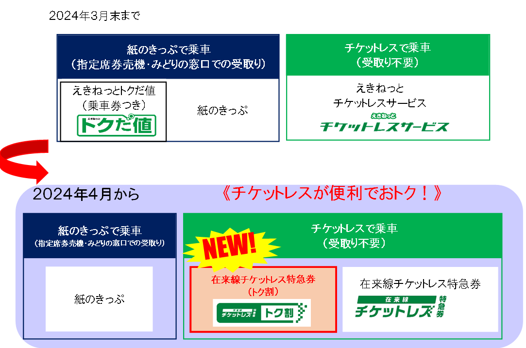 ※「えきねっとトクだ値」(乗車券つき)、「お先にトクだ値」(乗車券つき)は3月31日(日)乗車分で発売を終了します。