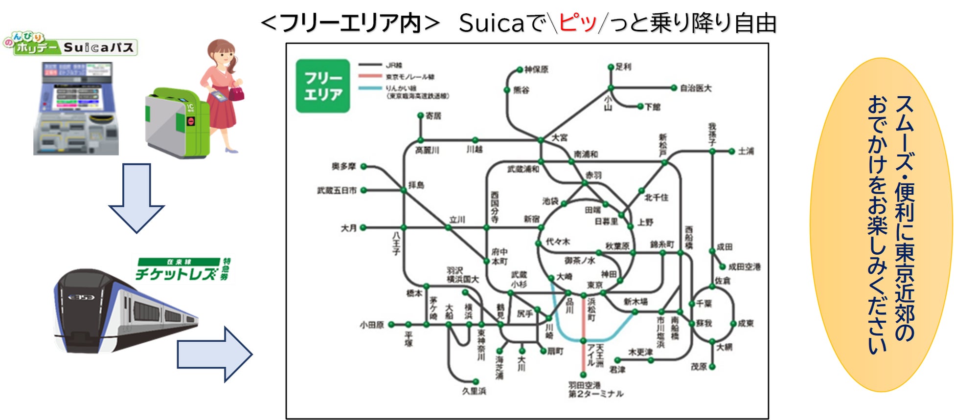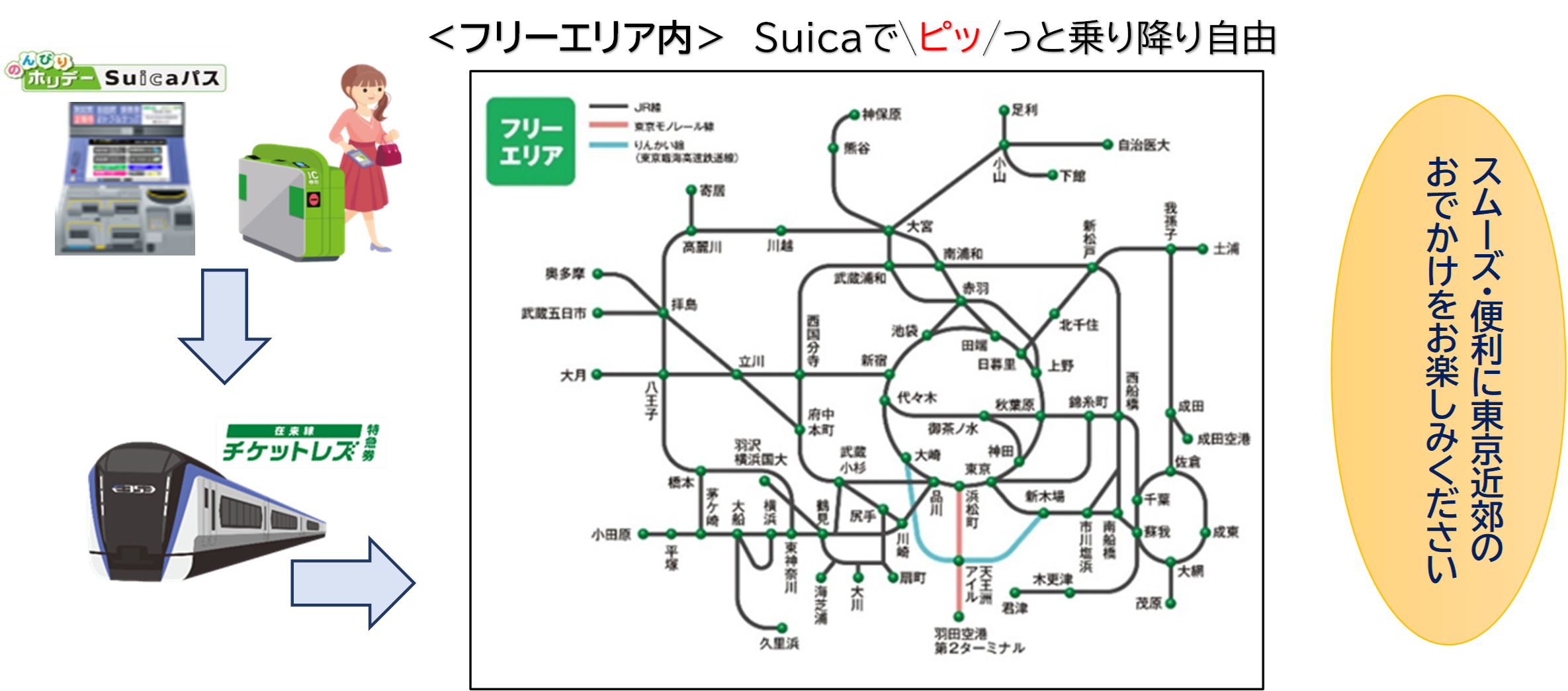 フリーエリア内のみで発売していた「のんびりホリデーSuicaパス」の発売エリアをSuica首都圏利用可能エリア(https://www.jreast.co.jp/suica/area/tokyo/pdf/tokyomap.pdf)へ拡大します。