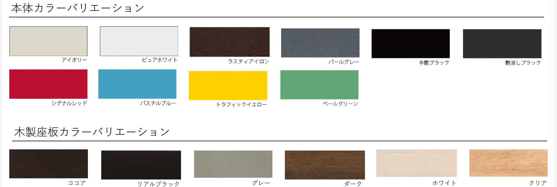 座面を壁固定し、補強と手すりを兼ねたパイプを天井固定するだけで成立します。この状態で耐荷重は120kg/m と、かなりの安定感があります。手すりとなるスチール部分は全 10 色、座面となる木製座板は全 6 色の展開です。