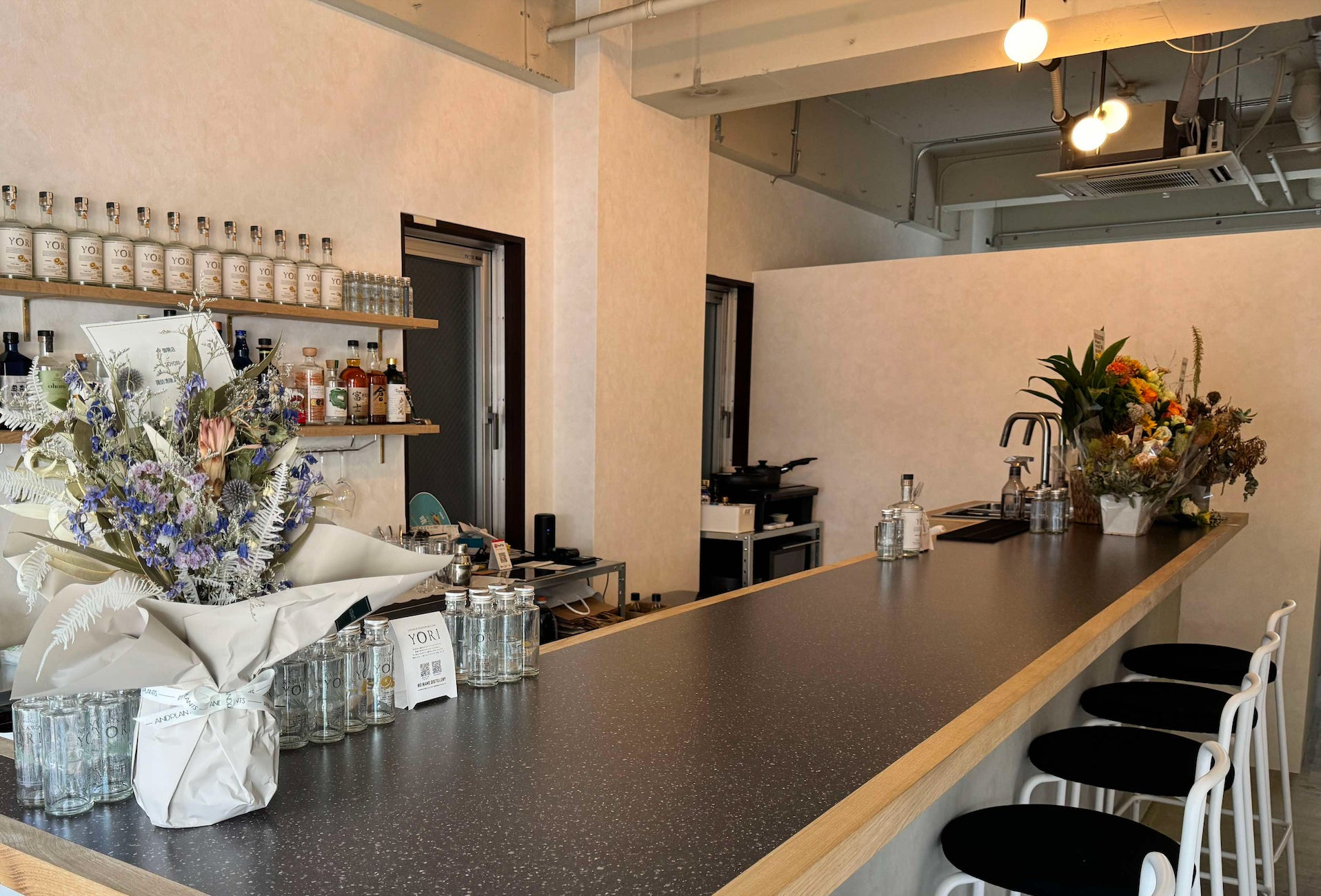 自社製造のサステナブルジンYORIを中心に、カフェ・バー・ショップとしての機能をもった店舗。日本中の地域食材や地酒を使ったメニューを提供し、地域と出会い味わえる拠点を目指す。