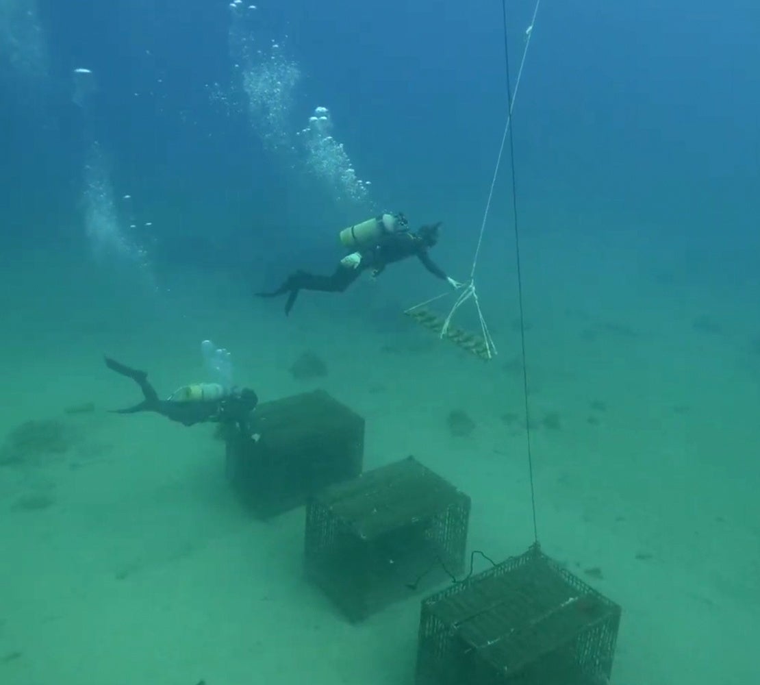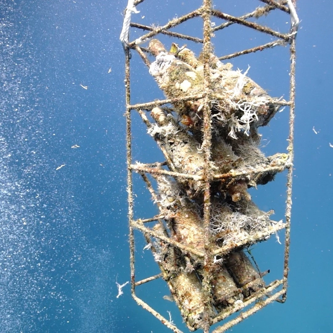 設置から1年半が経過した海底熟成セラーには、魚や貝、海藻など多様な海中生物が自然に集まり、当初の目的通り“魚礁”としての機能を果たし始めています。