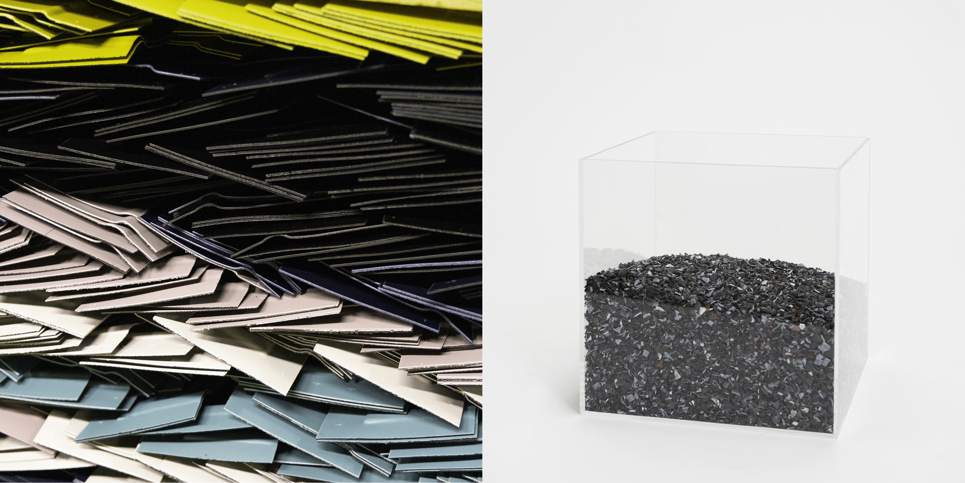 自社工場で本体シェルを製造する過程で、スーツケースの形に切り出す際に生じる端材を細かく砕いてチップにし、原料として100%本体シェルにリサイクルしました。