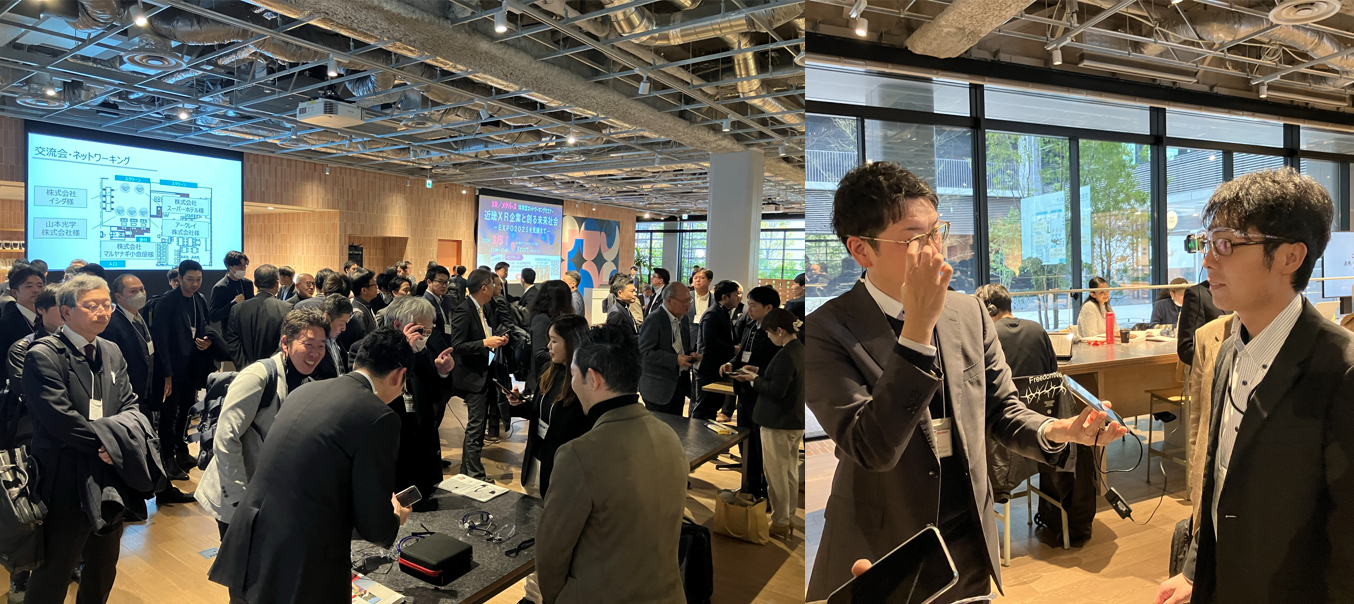 また、第二部として、発表企業と会場参加者のネットワーキングを図るための交流会を開催しました。発表企業との名刺交換で長蛇の列ができるなど、会場は大盛り上がりを見せました。発表企業の中には、実際の製品を見せながら共創可能性について議論されている場面もあり、終了ギリギリまで活発な意見交換が絶えませんでした。