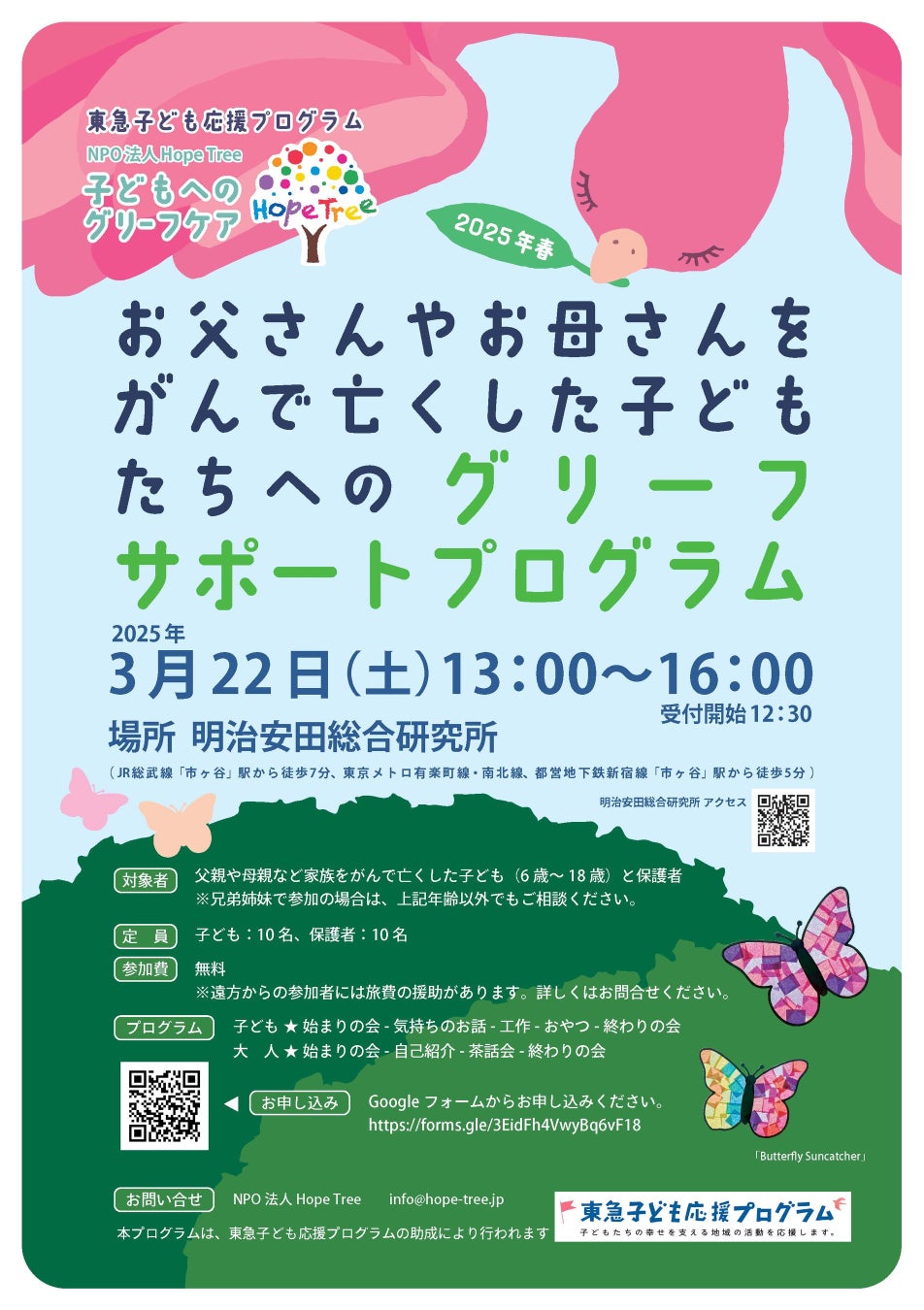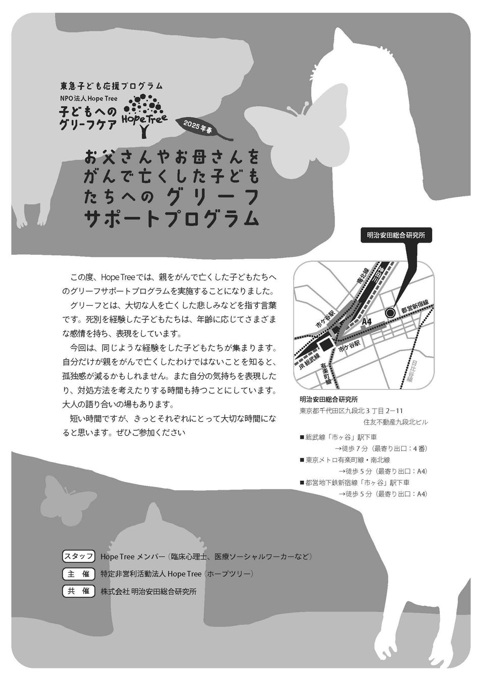 特定非営利活動法人Hope Tree主催、明治安田総合研究所の共催にて、がんで親を亡くした子どもたちへのグリーフサポートプログラムを実施いたします。