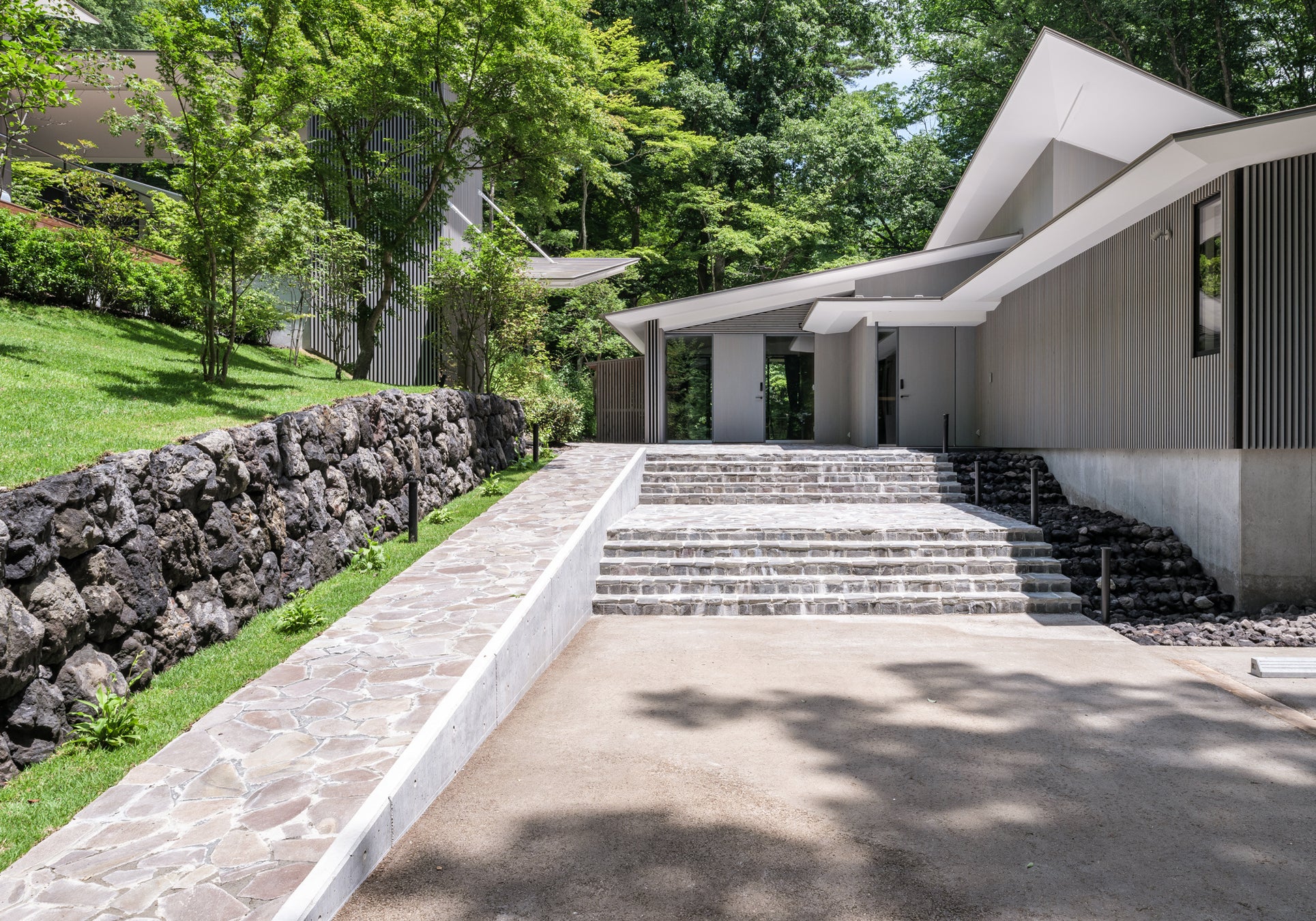 浅間⽯張りのゲートを通過し、ケヤキやニレの間を縫って伸びるアプローチを抜けると、2棟に囲まれたエントランスプラザに到達。サクラやモミジなど四季の彩りを持つ郷⼟種の植栽に歓迎されます。3,472.6平⽶の敷地に合計492.35平⽶の⽴体的につながる南北の別邸では、軽井沢らしい静謐な雰囲気の中で別荘ライフを堪能頂けます。