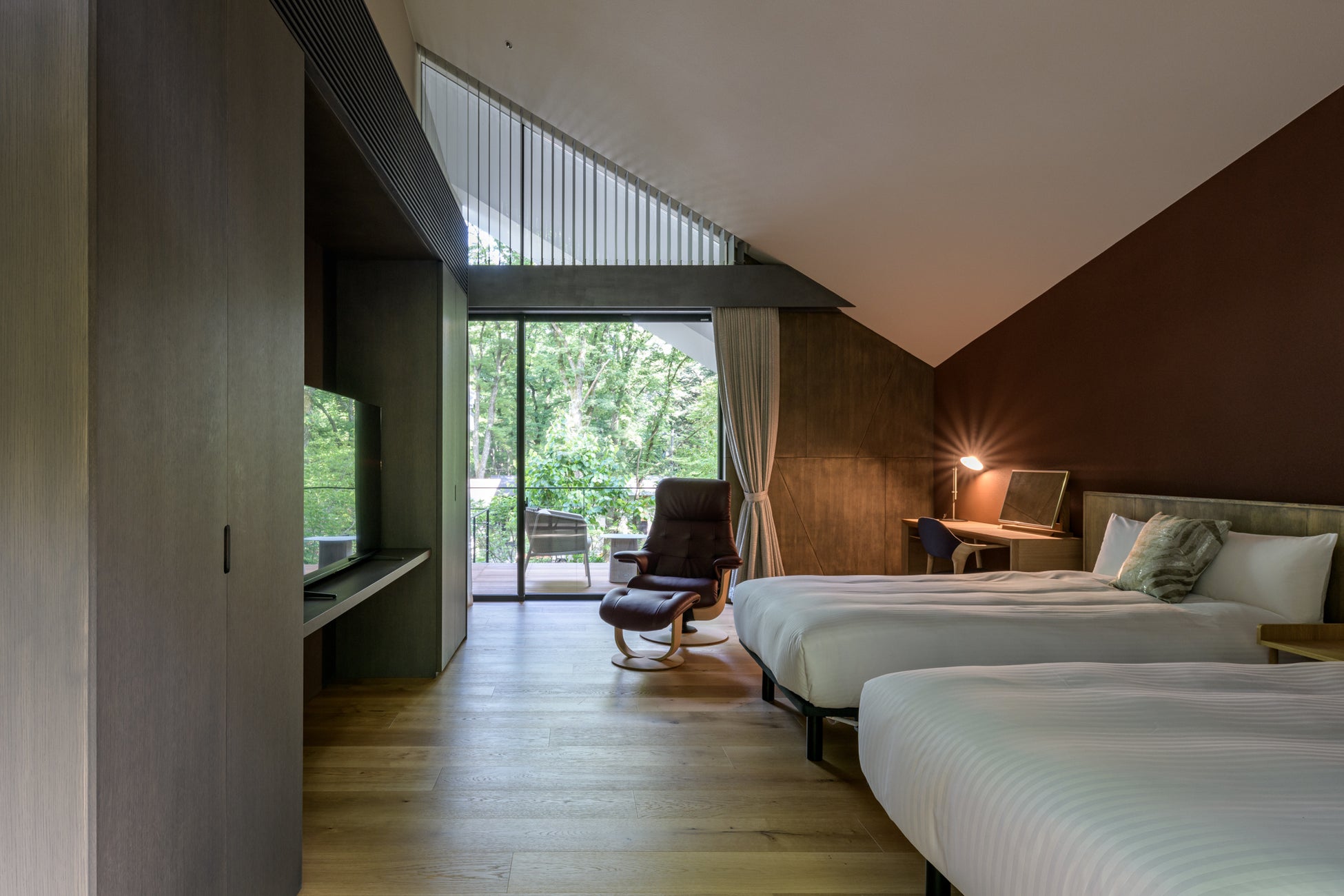 マスターベッドルームは独立性が高いプライベートな空間となっています。18帖と⼗分な広さに加え、吹き抜けの天井、書斎としても利⽤できるワークスペースがあります。南北それぞれのテラスからは、軽井沢の大⾃然がダイナミックに視界に入ります。その他、テンピュール製の電動ベッド、TVやリラックスチェアーを配備することで、くつろぎの空間を醸成しています。