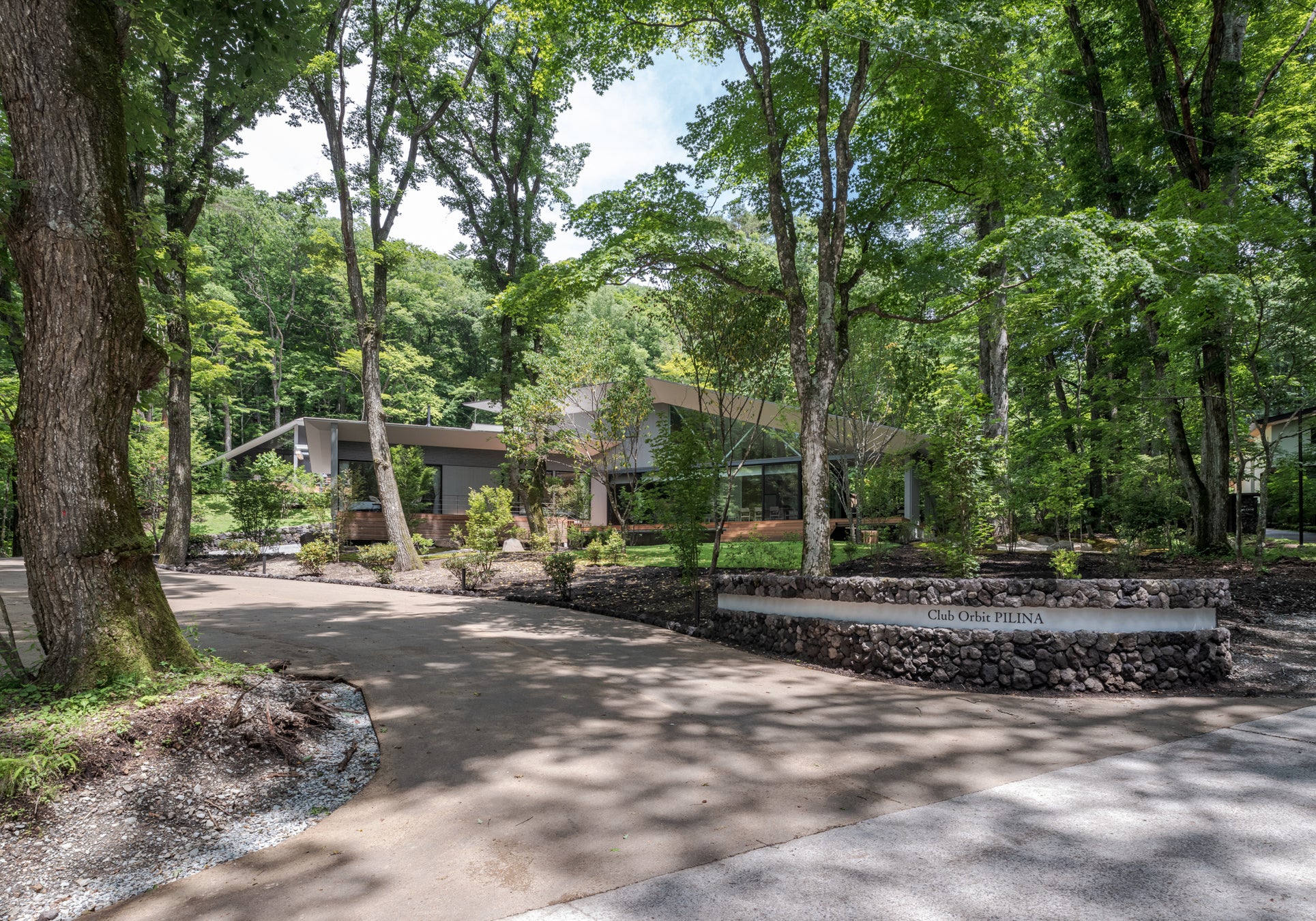 「Club Orbit PILINA」は、かつての建築が配置されていた2段の宅盤をそのまま活⽤し、上の段に北棟(North PILINA)、下の段に南棟(South PILINA)を配置しています。同学院の跡地をそのまま活⽤したことで、敷地内の多くの既存樹⽊が保全され、完成時点で既に成熟した森の中の佇まいを⼿に⼊れました。建築は軽井沢で多くの別荘を手掛けている株式会社プロップ・ポジションの小杉浩久氏が設計しています。