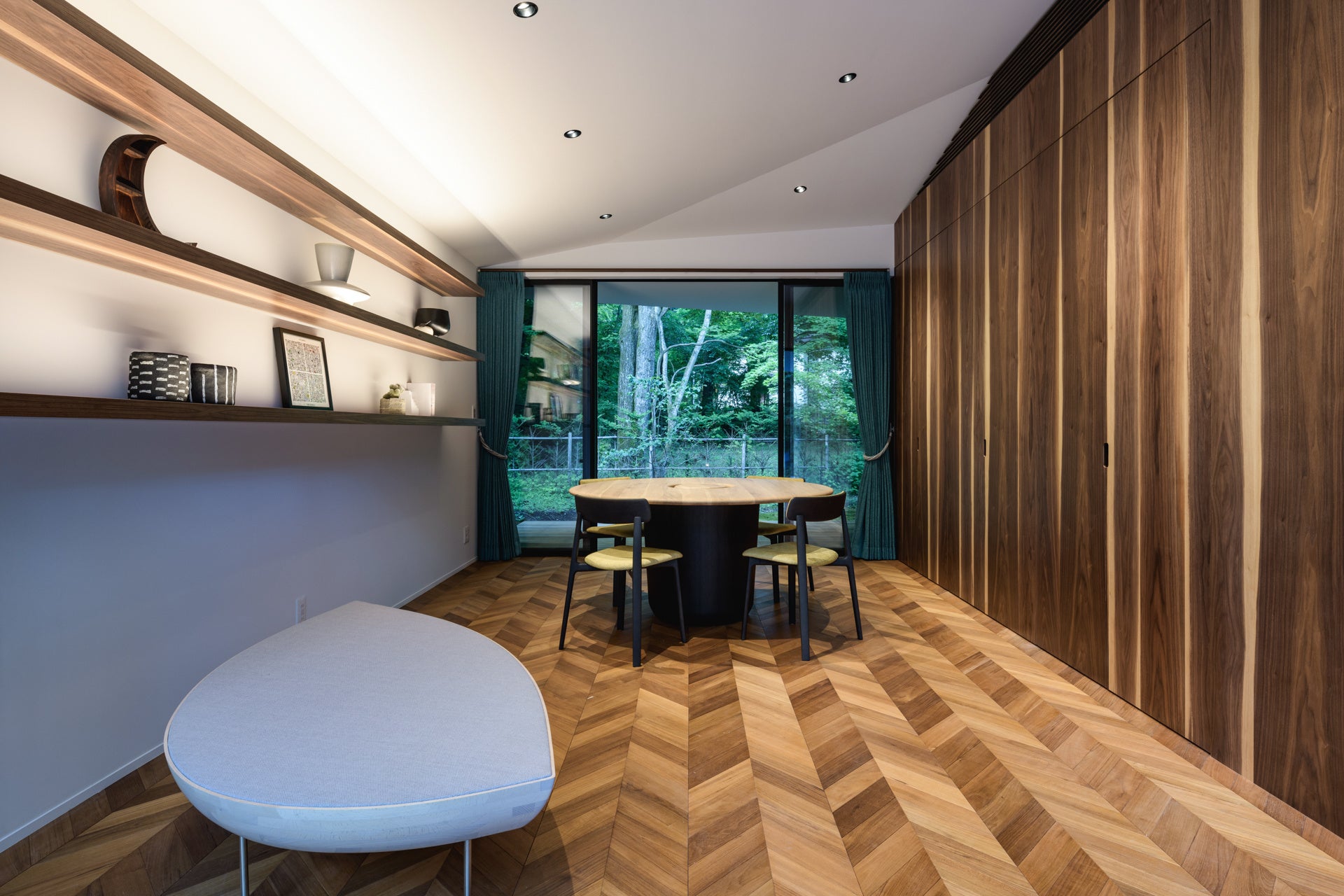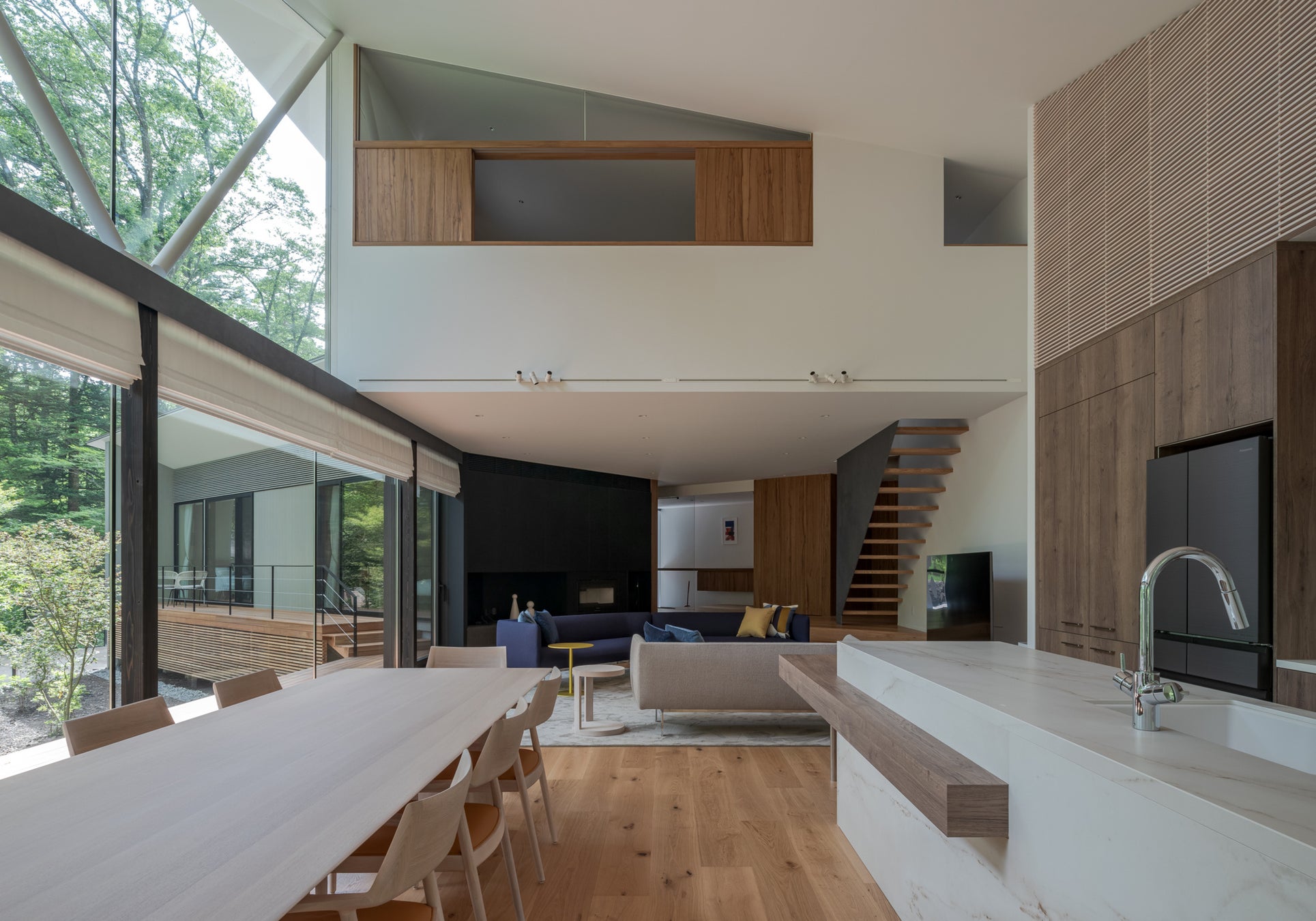 ジャパンディにコーディネートされたリビングルームは、約47帖の広さに加え、最⾼約6mの天井高となります。この迫力ある空間で、四季それぞれに美しい⾃然を眺めながら、ネット対応の75インチTVモニターとサラウンドシステム(Dolby Atomos対応)、映画やお気に入りの⾳楽をお楽しみいただけます。