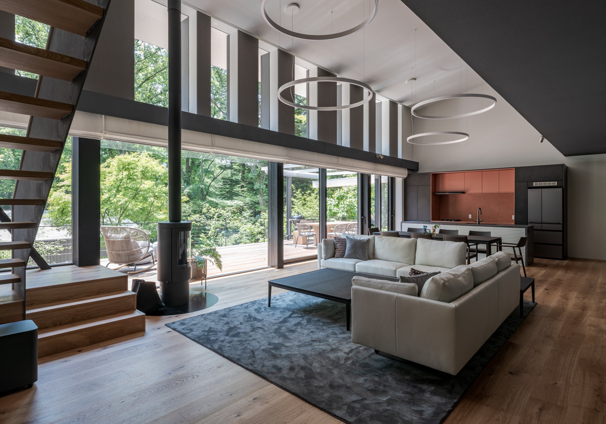 ⾼台に位置するNORTH PILINAは、3LDK、225平⽶の空間で、こちらも8名まで寝具の用意があります。大きな開口部を持つLDKからは荘厳な愛宕の森が眼前に広がり、眺望を重視した建築となっています。インテリアはイタリアンモダンなテーストで統⼀。本物の薪ストーブを囲むくつろぎの空間をエレガントに彩ります。
