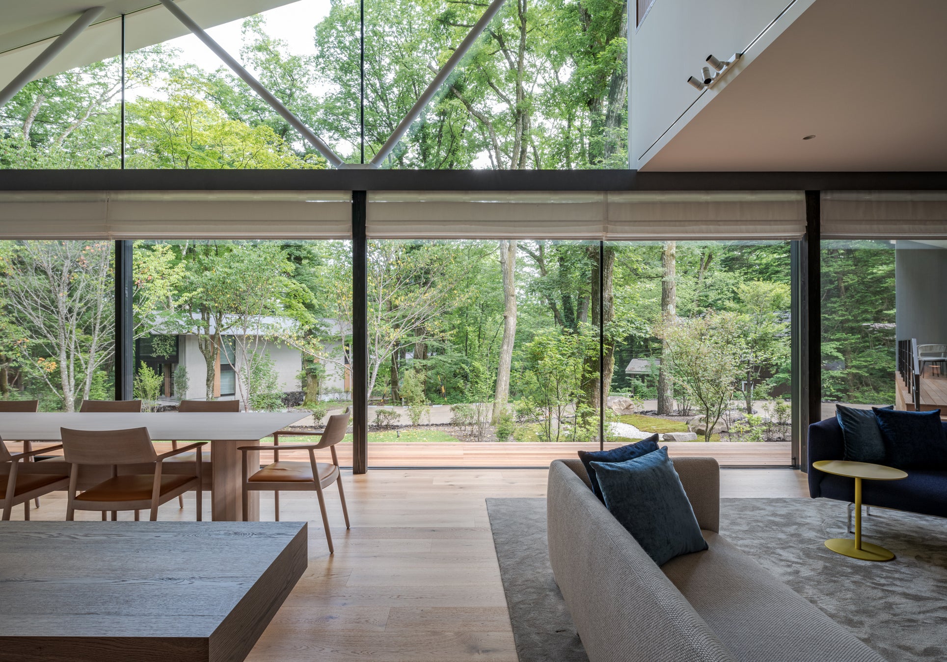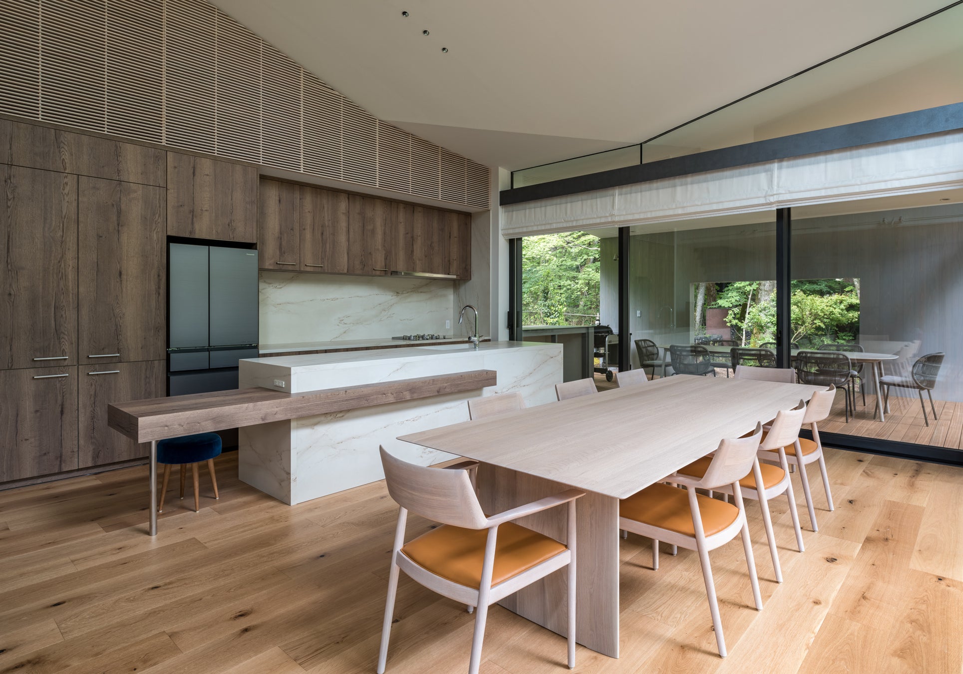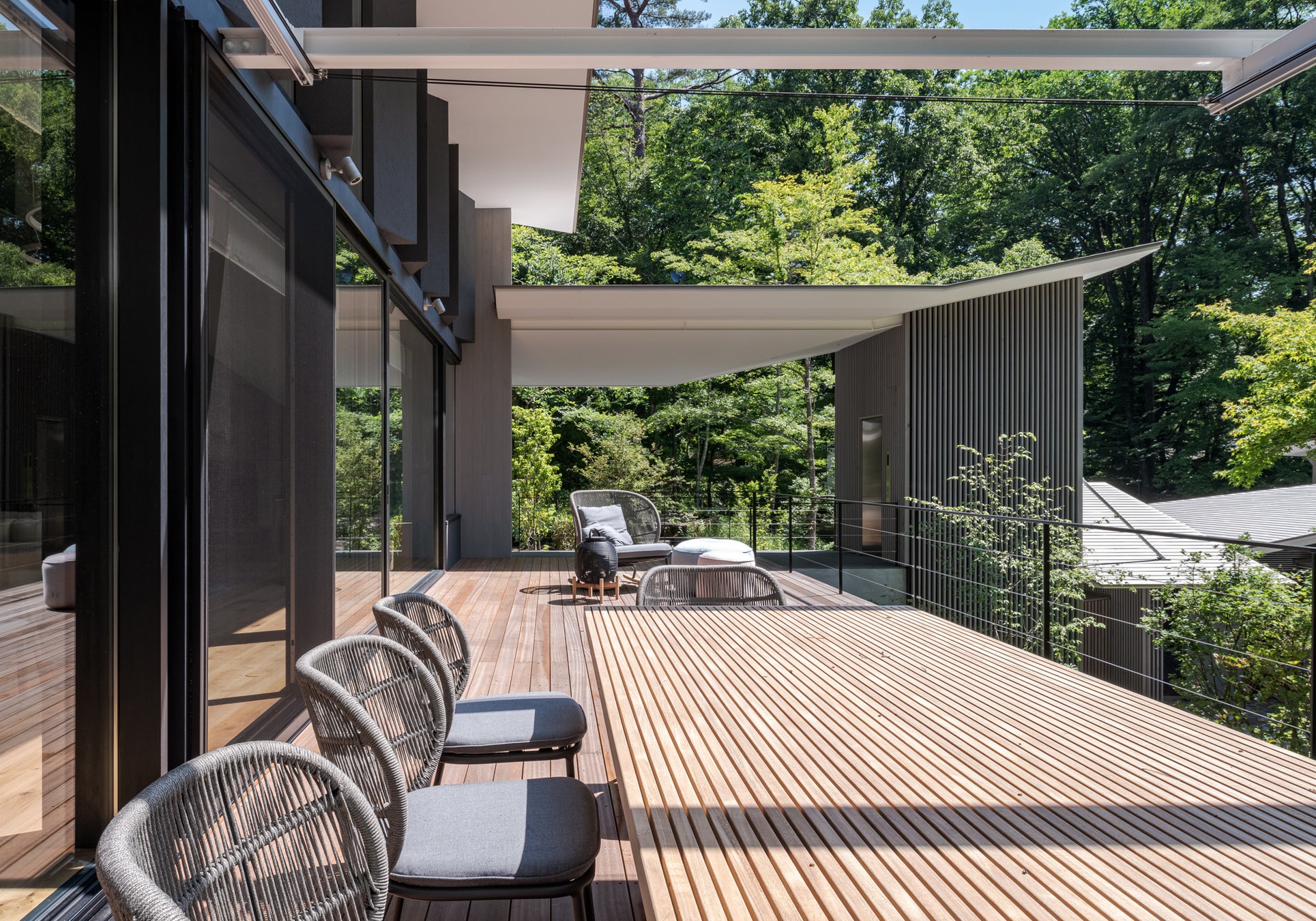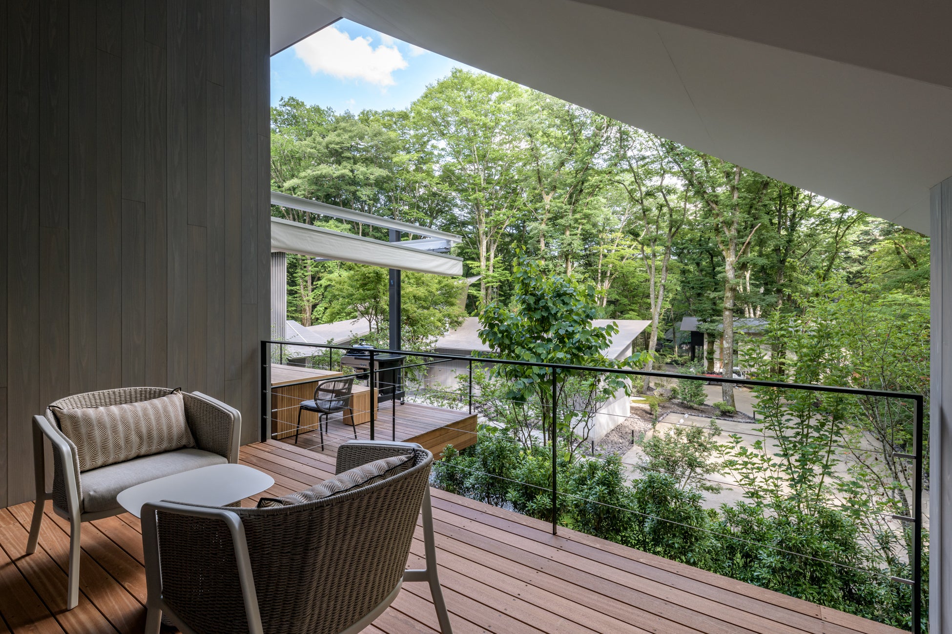 リビングには幅約12mの広大なオーニング付のテラスが隣接しており、軽井沢の自然を見渡しながらのティータイム、アウトドアランチ、ディナーパーティを楽しめるセカンドリビングとして利用できる空間です。