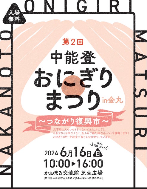おにぎりは災害時には非常食になります。石川県中能登町では、災害時の人の命をつないできた「おにぎり」を通して、色んなご縁を結ぶイベント『第2回 中能登おにぎりまつりin金丸 つながり復興市』を6月16日に開催。ニコニコのりは、一般社団法人おにぎり協会・おにぎりサミット 参加自治体・企業チームとして参加いたします。