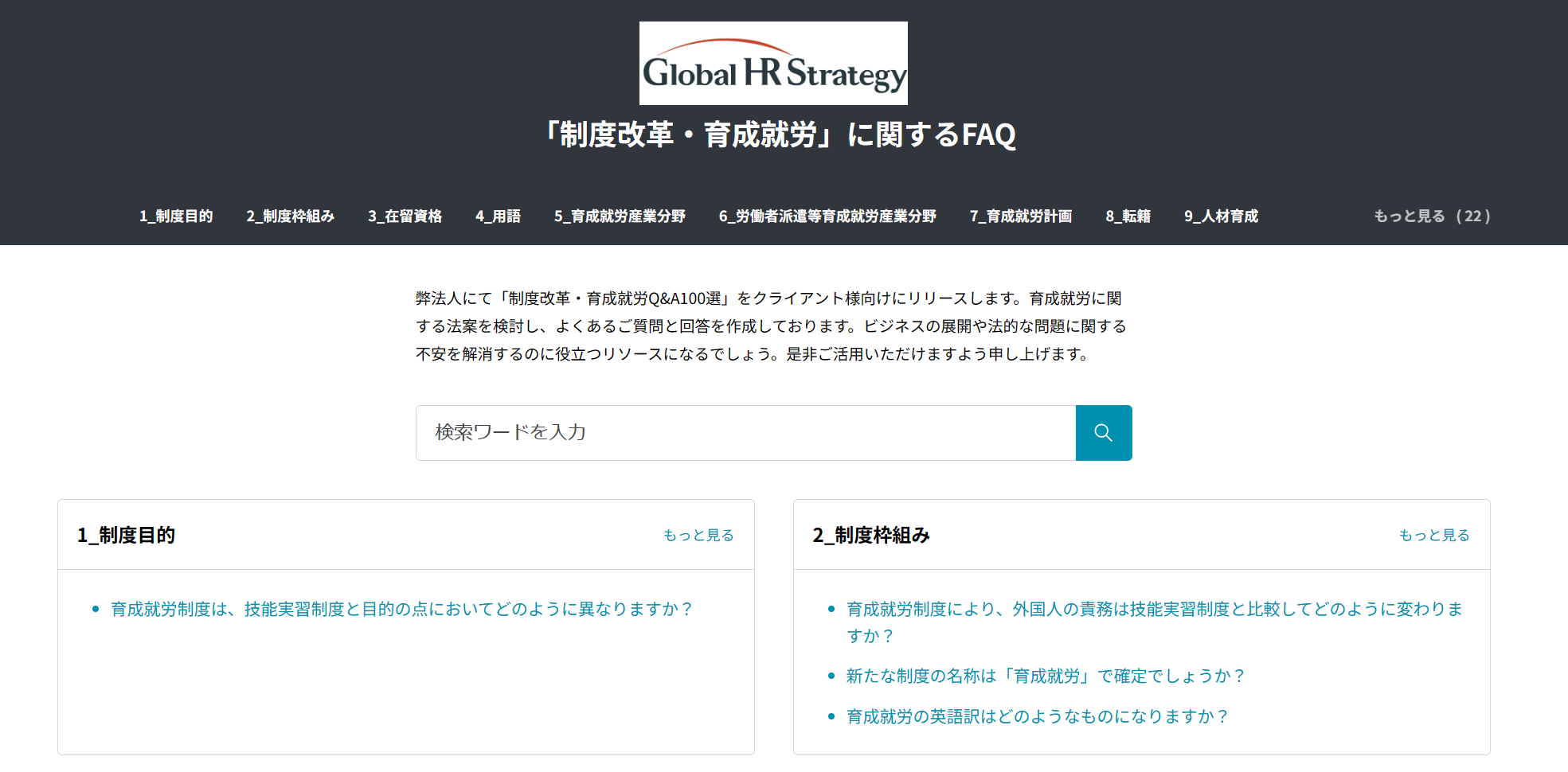 まずは注目度の高い育成就労に関する法案を専門家が検討したFAQ「制度改革・育成就労Q&A100選」を公開しました。各質問と回答は「制度目的」、「制度枠組み」、「育成就労産業分野」といった様々な項目に分けて掲載されており、必要な情報を効率的に入手できます。今後、外国人雇用に関するFAQをさらに充実させてまいります。