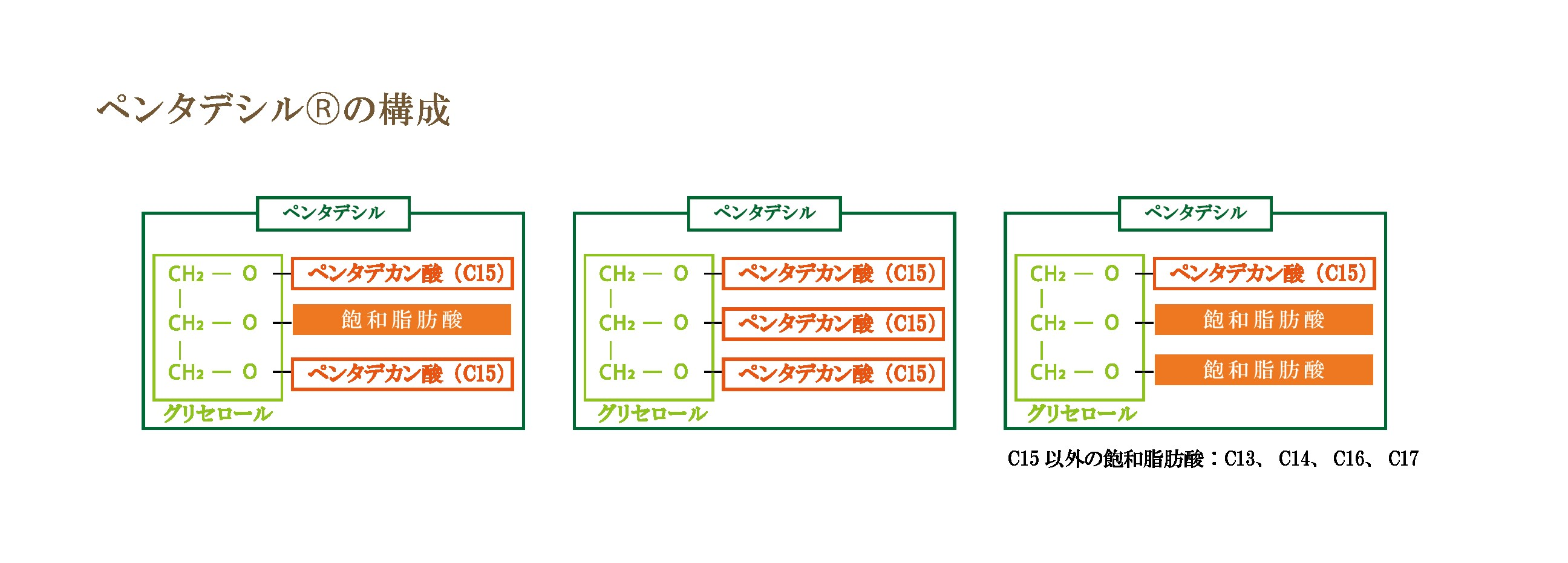 ペンタデシルⓇ:ペンタデカン酸を高含有する飽和脂肪酸のみで構成されるトリグリセリドのことです。
