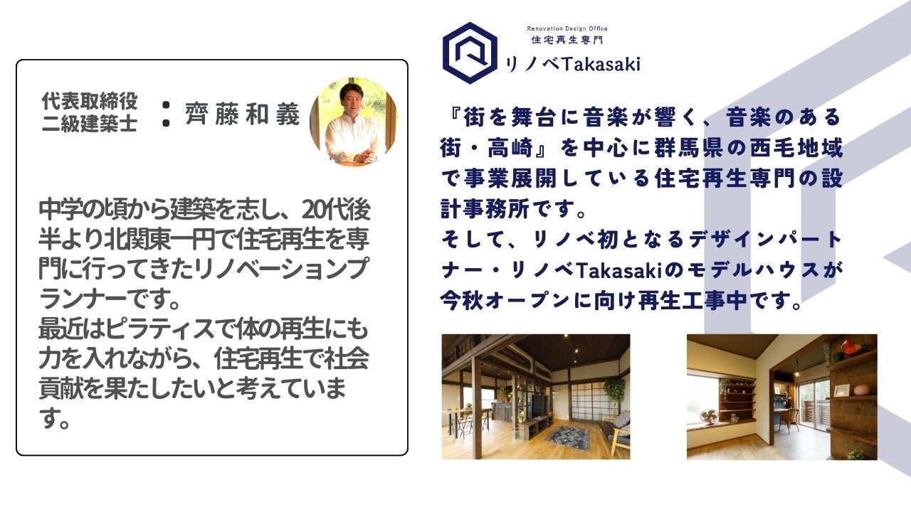 群馬県沼田市にあるリノベーション専門の設計事務所。27年の建築経験の中で、大手リフォーム会社に19年在籍し200棟を超える物件を担当。群馬県前橋市には築46年の木造2階建てをリノベーションしたモデルハウスがあり、随時見学可能。