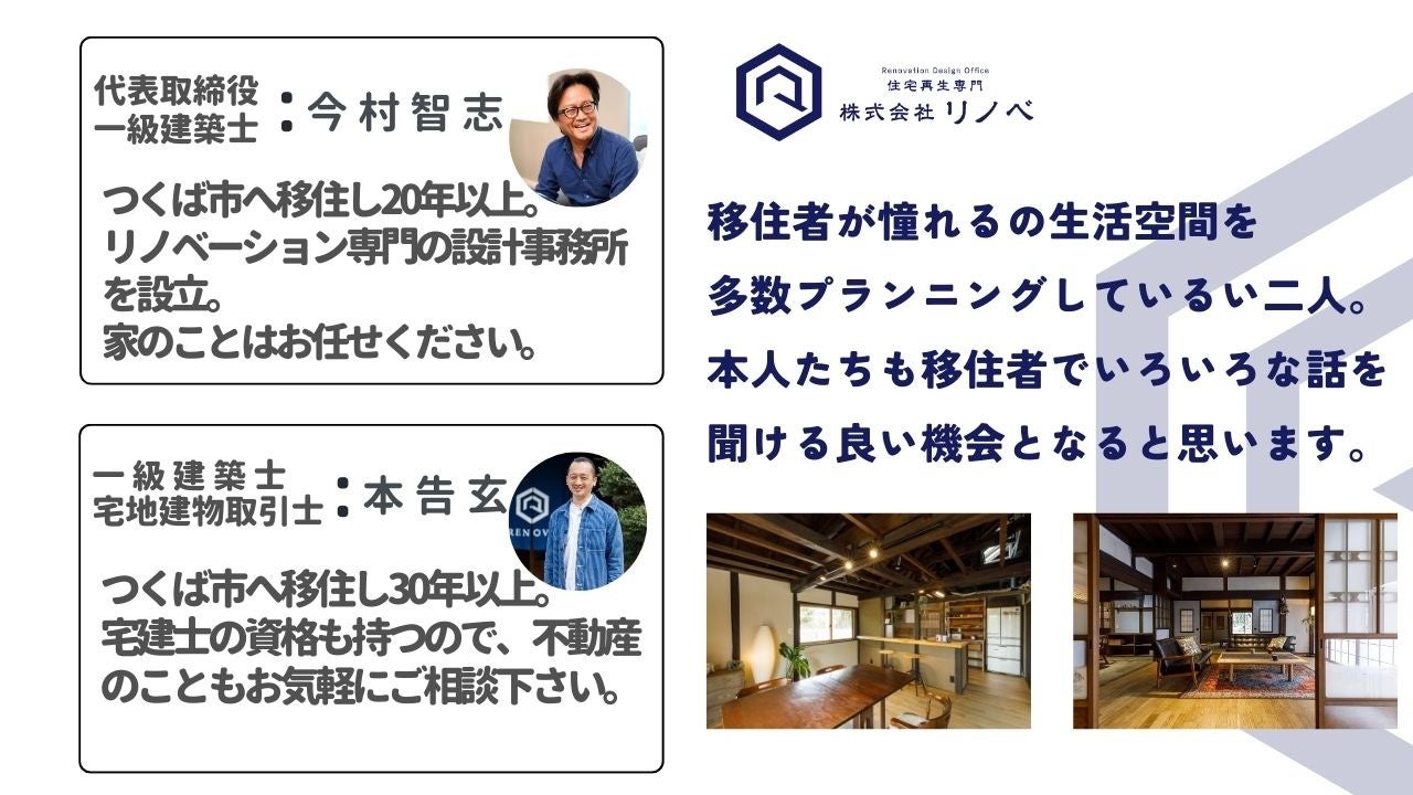 茨城県つくば市にあるリノベーション専門の設計事務所。これまでに茨城県つくば市を中心に古民家を含む約600棟以上の住宅を再生しています。自社で再生販売した物件数は約20棟以上。代表の今村は、住宅再生を取り上げたラジオやテレビなどのメディアにも出演しております。スタッフのほとんどが県外出身者。茨城への移住経験を踏まえて「住まい」を通し、移住のお手伝いも行っております。