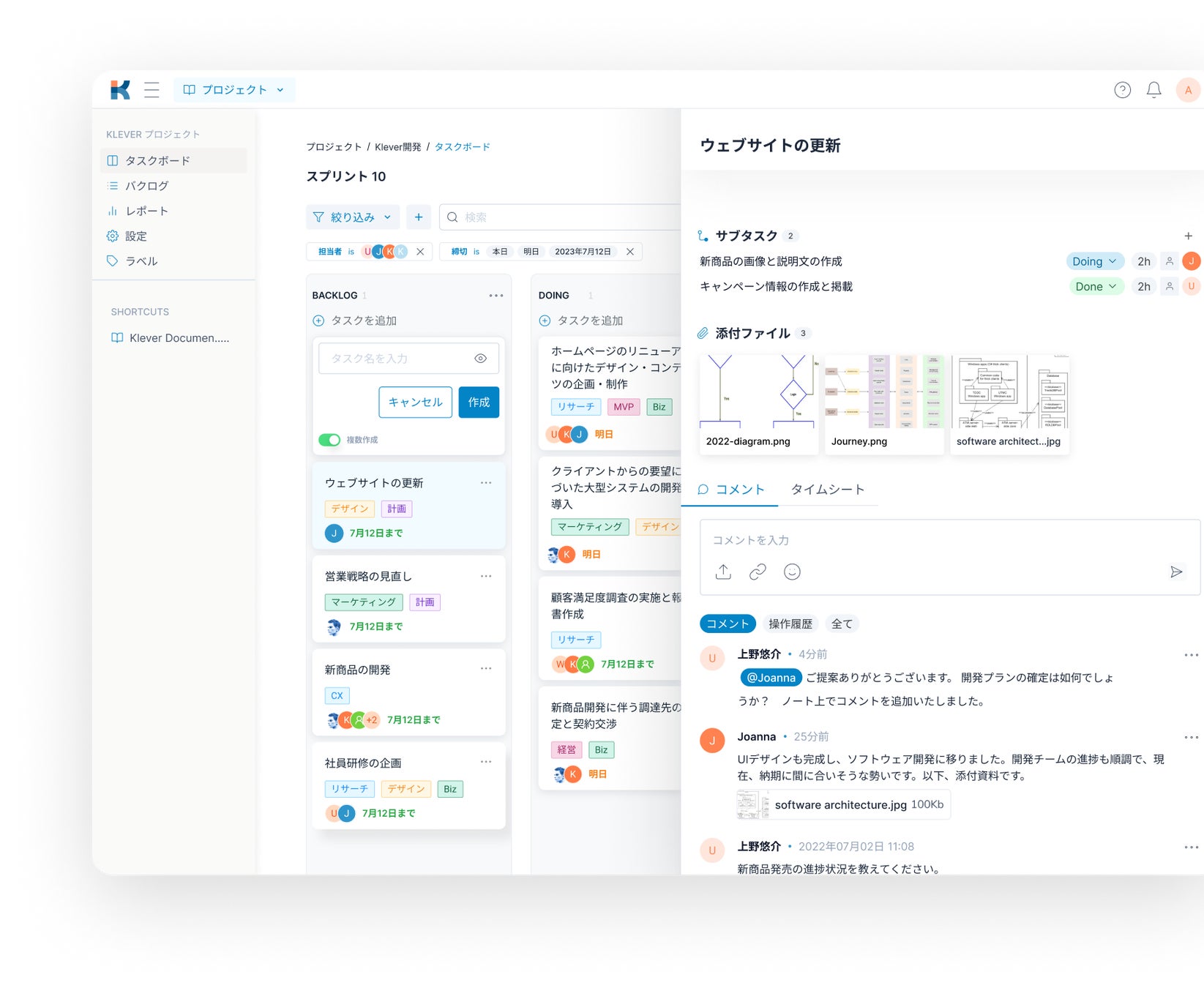 カンバンボードやガントチャートで進捗をリアルタイムに可視化。チーム全体の状況把握が容易になり、遅延リスクを低減します。