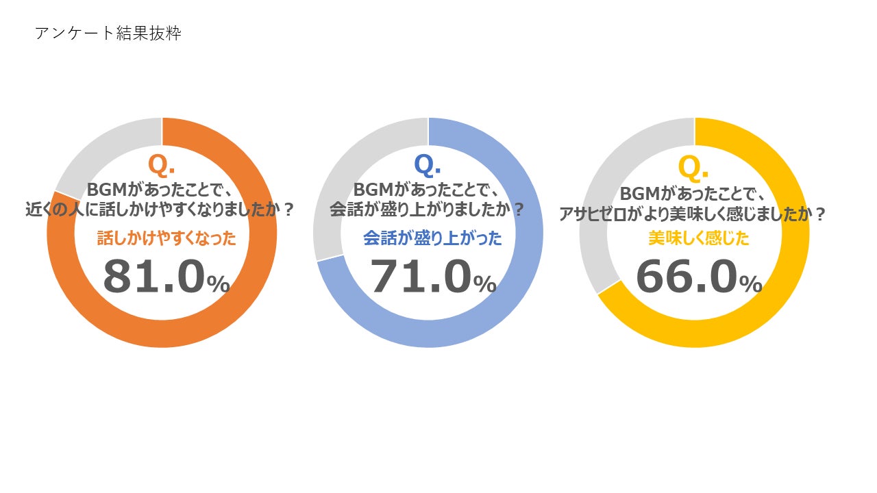 実験の結果、参加者の66%が「BGMがあることでアサヒゼロやおつまみが美味しく感じた」、同81%が「話しかけやすくなった」、同71%が「会話が盛り上がった」と回答し、飲食機会において適切な音環境が体験価値を向上させることが確認できました。