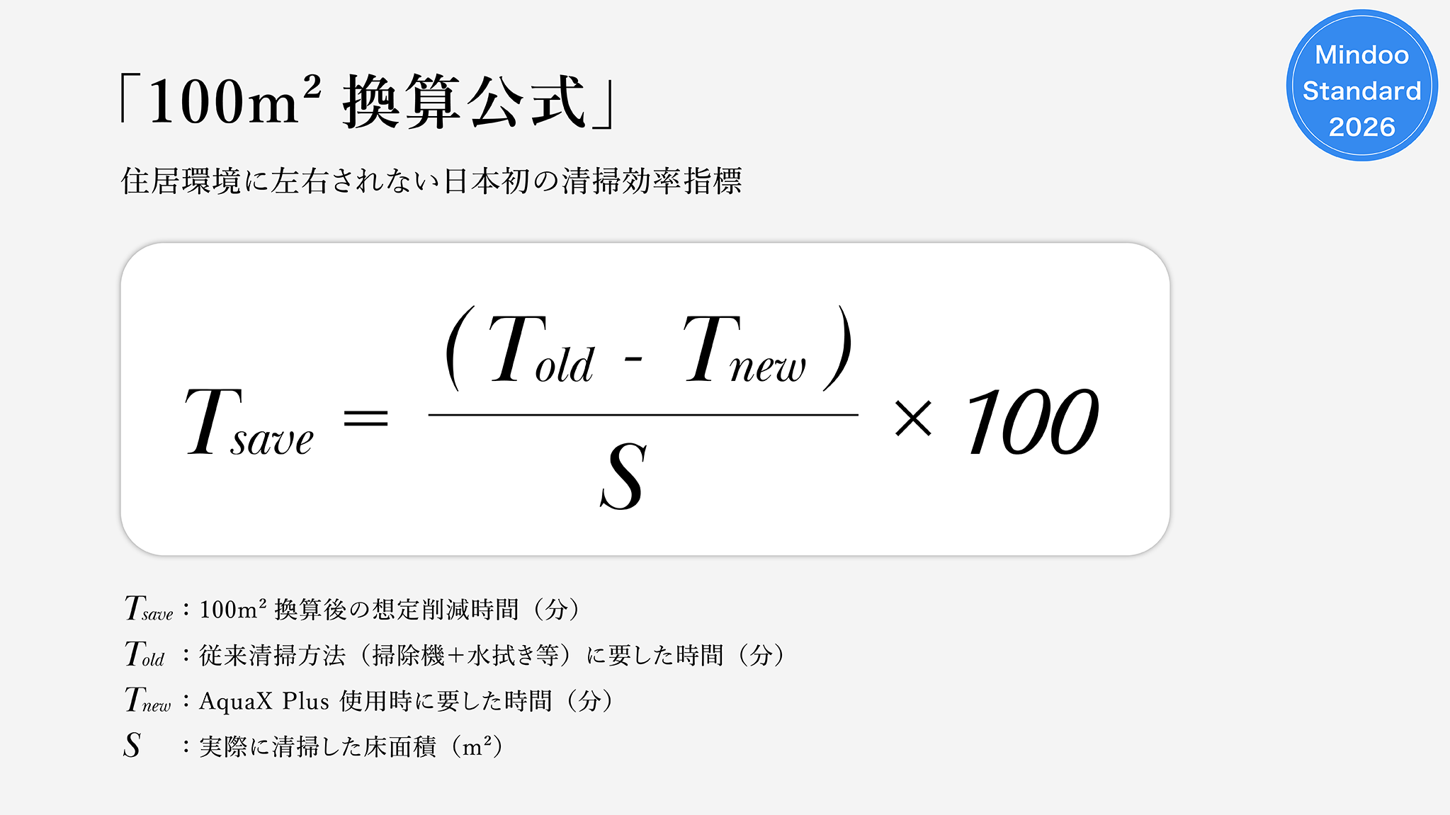 本検証では、検証の公平性と再現性を担保するため、住居面積を補正する標準換算方式を採用します。清掃時間と清掃面積を基に算出した数値を、すべて100㎡あたりの時間削減量として統一集計することで、参加家庭間での条件差を最小化した比較を可能にします。