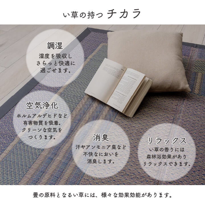表生地に使用しているい草には、その素材そのものが備えている素晴らしい効果があります。畳の部屋で感じることができるリラックス感はもちろん、湿気を吸収する力や消臭する力、空気をキレイにしてくれる力など、私たちの暮らしにやさしい機能をたくさん持ち合わせています。