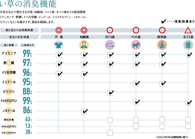 生活の中で発生する汗臭や加齢臭、ペット臭、タバコ臭などさまざまなニオイの原因物質を減少させる力がい草にはあります。特に汗臭の元であるアンモニアについては99%を減少させることができ、たとえ長時間の使用で汗をかいたとしても汗のニオイが商品に残ることはありません。