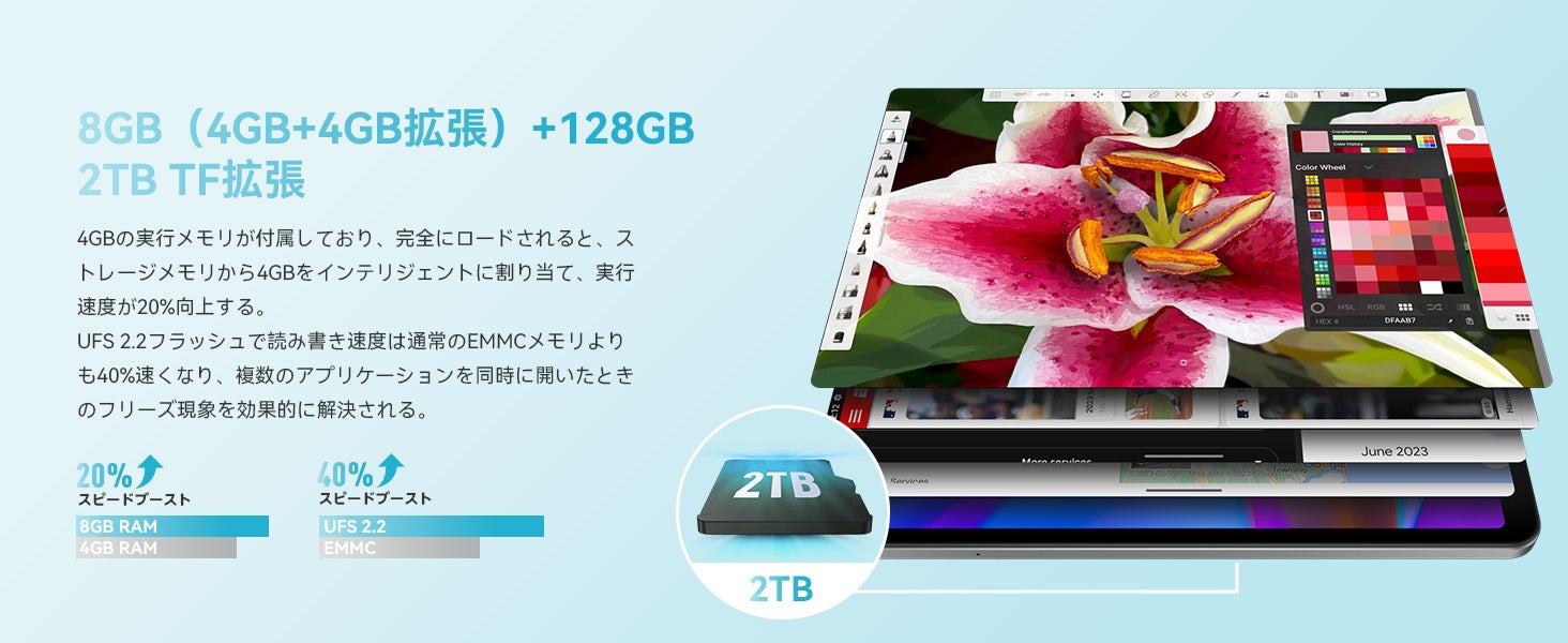現代人の高度な電子製品の使用ニーズにとって、優れたCPUは非常に重要です。Fpad3はUnisoc T616八核心チップを採用しており、スマートなオフィスワーク、効率的な学習、音楽や動画のエンターテインメントなど、あらゆるシーンに対応できます。2つの大型コアA75 @ 2.0GHzと6つのA55 @ 1.8GHzのスマートAIチップを搭載し、演算速度が速く、Antutuスコアは260,000点に達することができます。