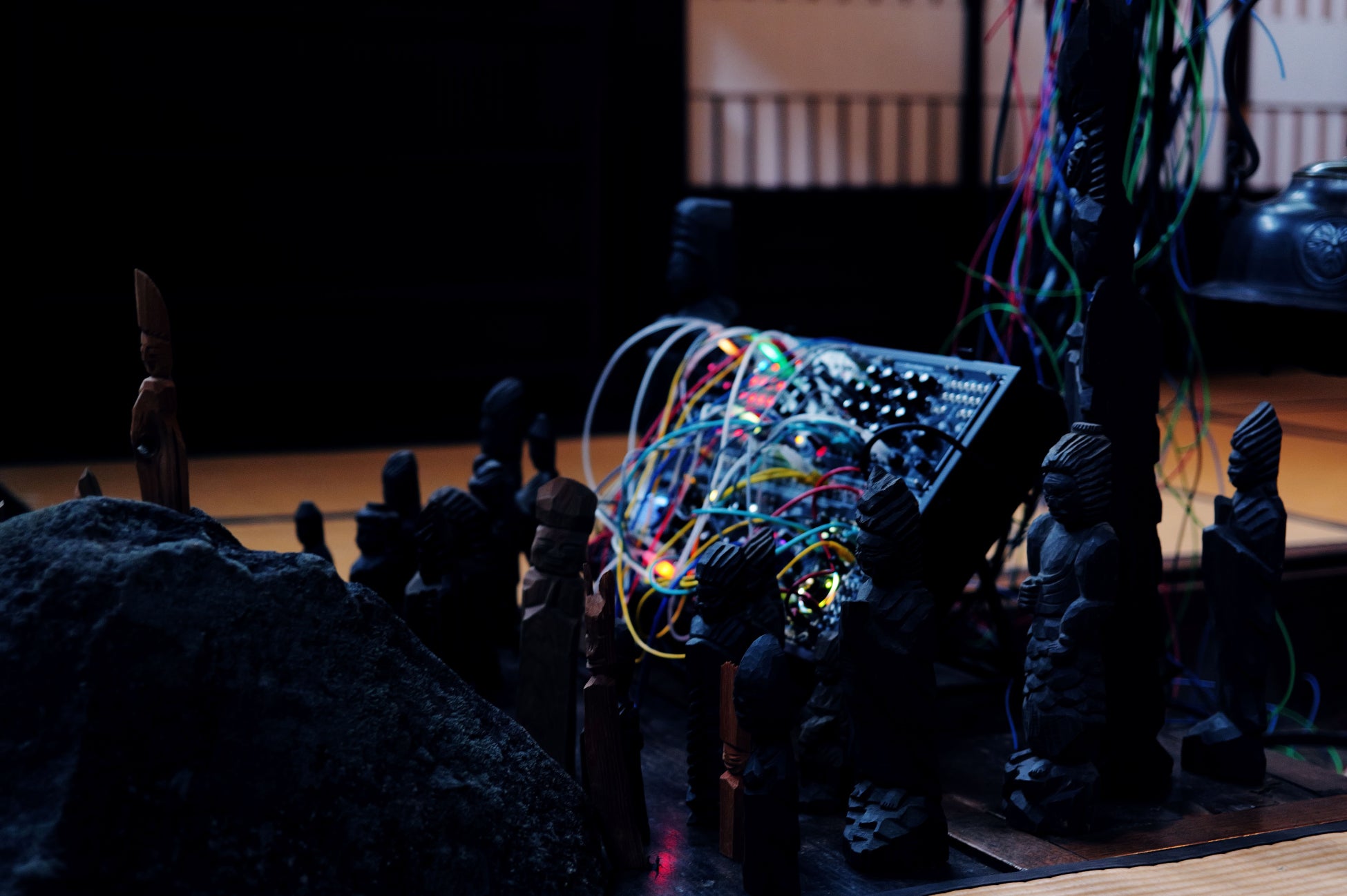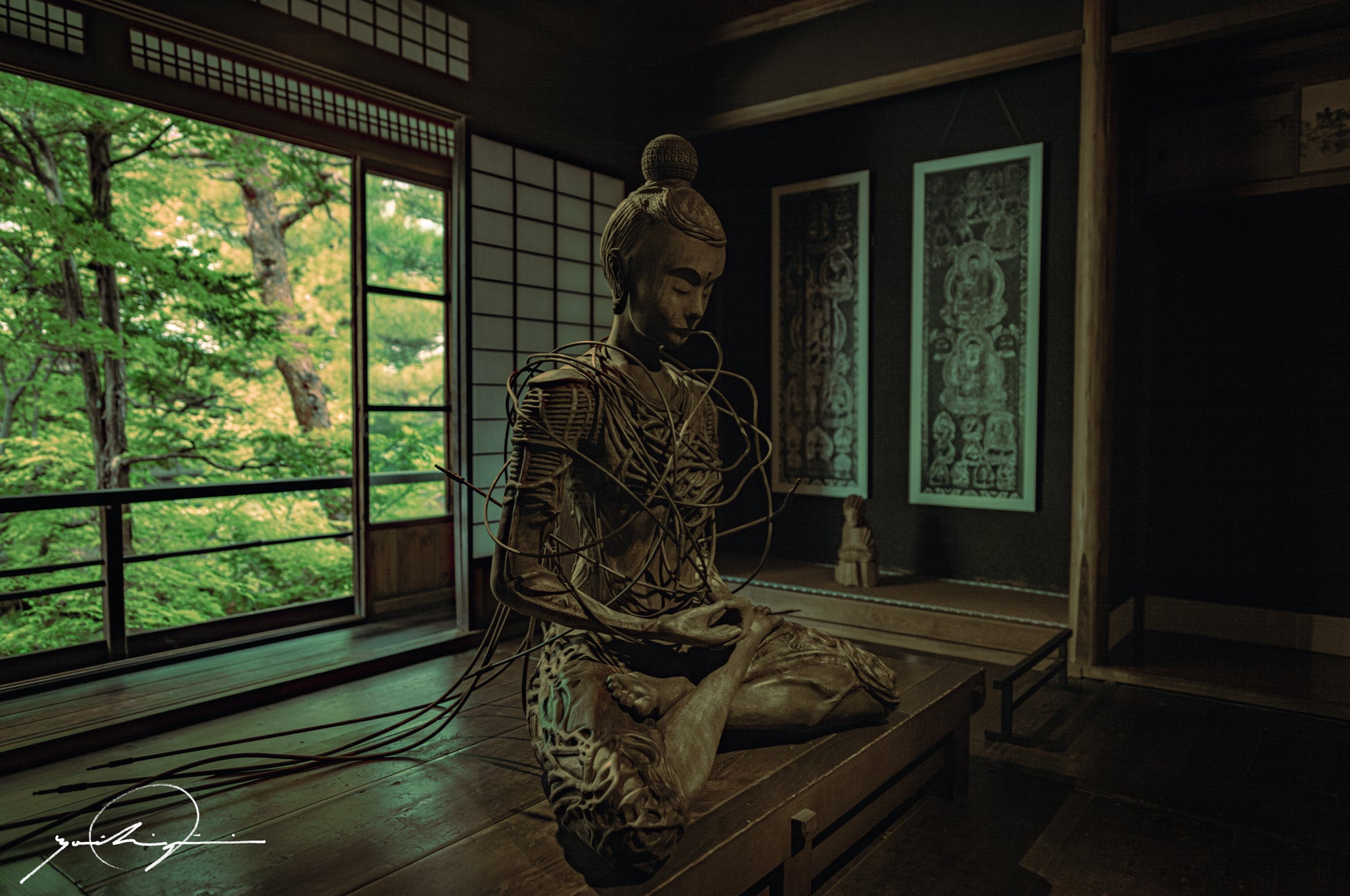 《鵺 null-e》は、彫刻という手仕事に根ざした身体的な表現の中に、アルゴリズム、情報、そして仏教哲学を深く融合させた作品です。木とデジタル、祈りとコード、伝統と未来をひとつなぎに変換するこの像は、まさに「異なる次元を貫通する変換装置」として、「テトラレンマ」の構造そのものを象徴しています。その像を中心に据えることで、観る者は、人間性や信仰、物質とテクノロジーのあいだの境界がとけ合う、新たな世界の風景を垣間見ることとなるでしょう。