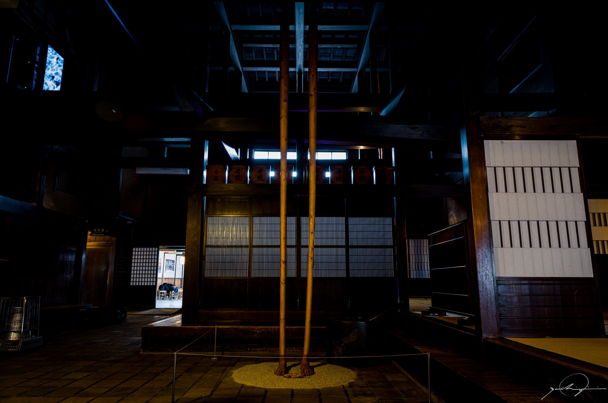 落合が提示する壮大な思想実験《ヌルのテトラレンマ》を、飛騨高山という歴史と民藝の文脈の中で、実空間に実装する試みです。舞台となるのは、日本を代表する民家建築として知られる重要文化財・日下部民藝館と吉島家住宅、そして古民家を改装したギャラリー&カフェ「おんど」の三会場。そこに万博会場「null²」を加えた四つの空間で構成され、それぞれが“テトラレンマ(四つの命題)に呼応する表現を担います。