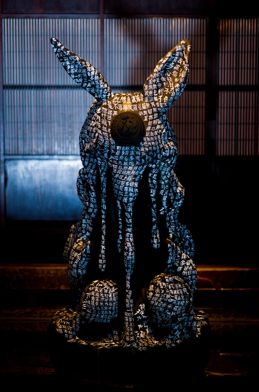 ここに鎮座する木彫〈鵺-null-e〉は,まさにその境界の溶解をかたちにしたものだ.頭の猿は知性を,胴の虎は力動を,尾の蛇は無限の循環を示す.猫を加えた十三支が混ざり合い,江戸の吉祥獣〈寿〉の祝祭が外殻を彩る.