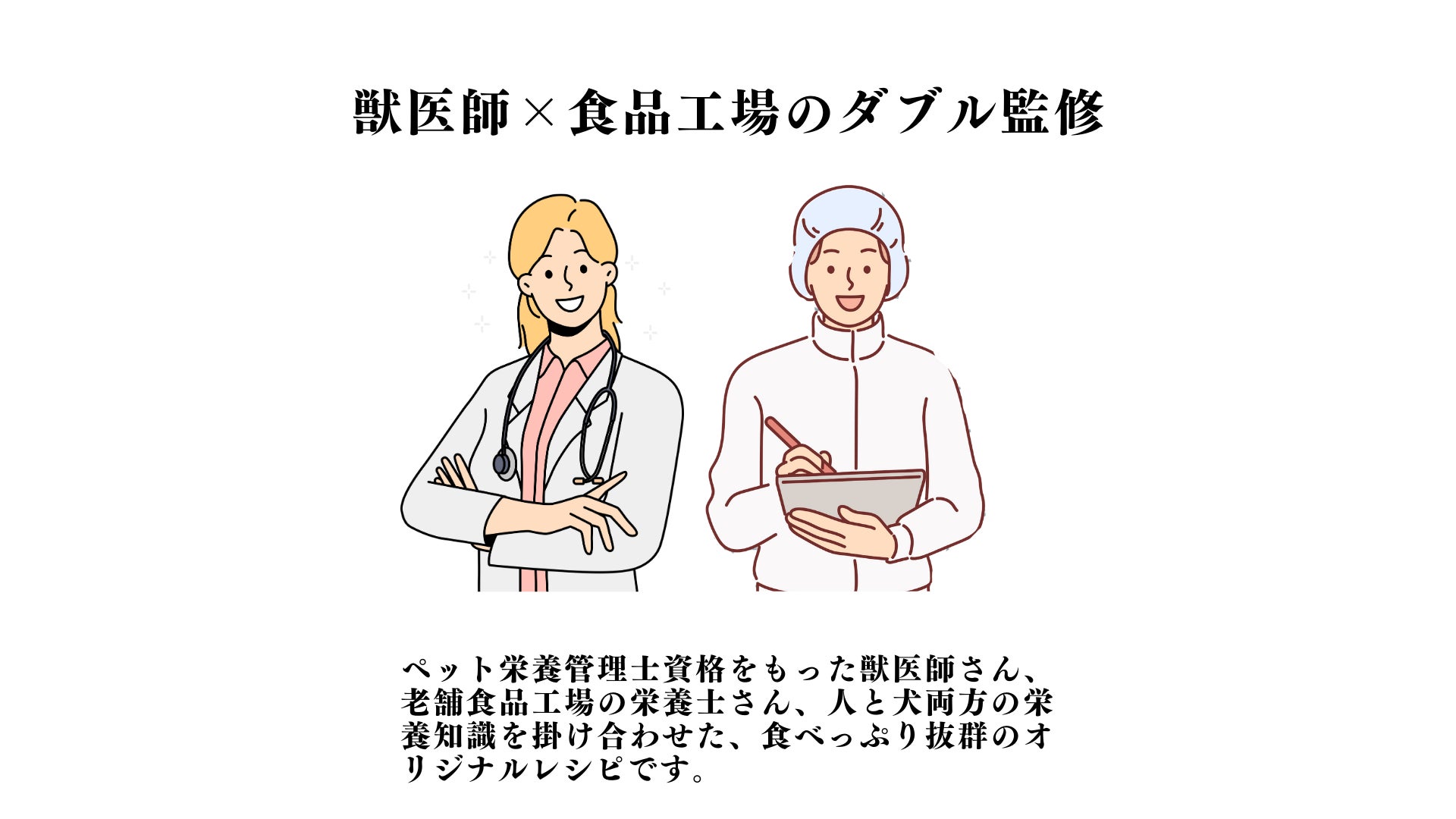 ペット栄養管理士資格を持った獣医師さん、老舗食品工場の栄養士さん、人と犬両方の栄養知識を掛け合わせた、食べっぷり抜群のオリジナルレシピです。