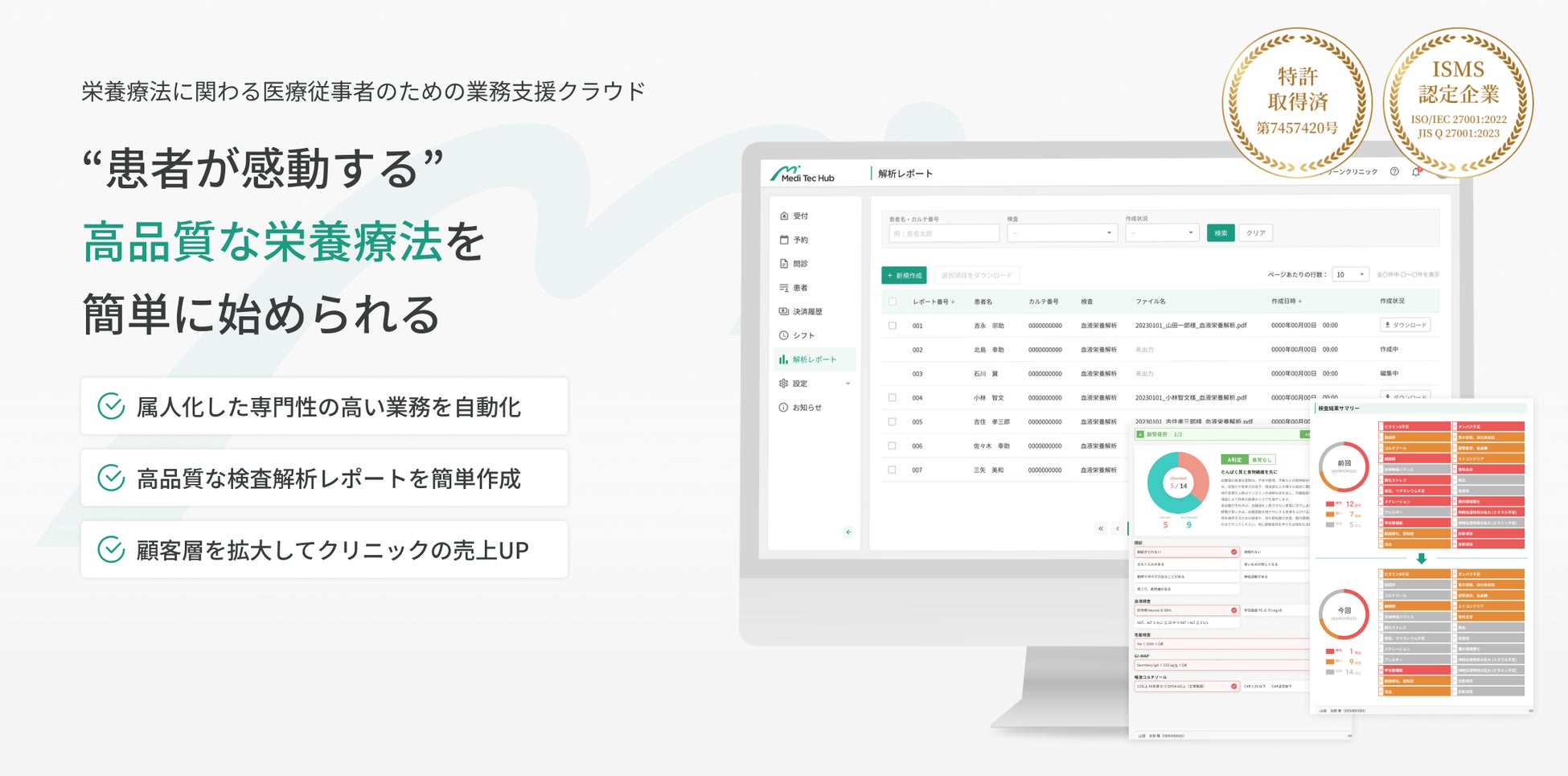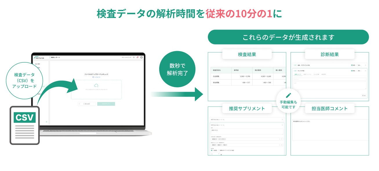 本技術は、SaaS型診療支援ツール「メディテックハブ」内の「血液栄養解析レポート」機能に実装されており、わずか数秒で検査データの評価・推奨サプリ・生活習慣改善提案などを含む構造化レポートを出力します。