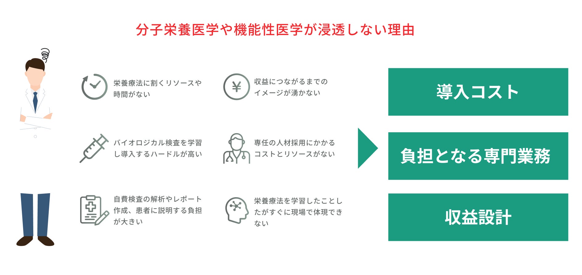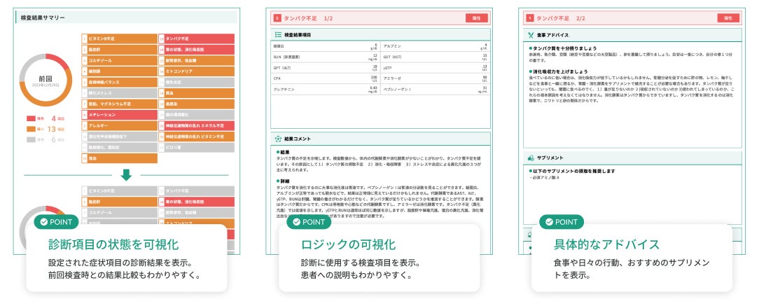 分子栄養学や機能性医学の広がりとともに、検査データに基づく自由診療の導入が全国の医療機関で進んでいます。しかし、診療設計や説明が医師の経験や属人的知識に依存している現状では、再現性・納得性・継続率の確保が難しく、業務負荷も大きいままでした。