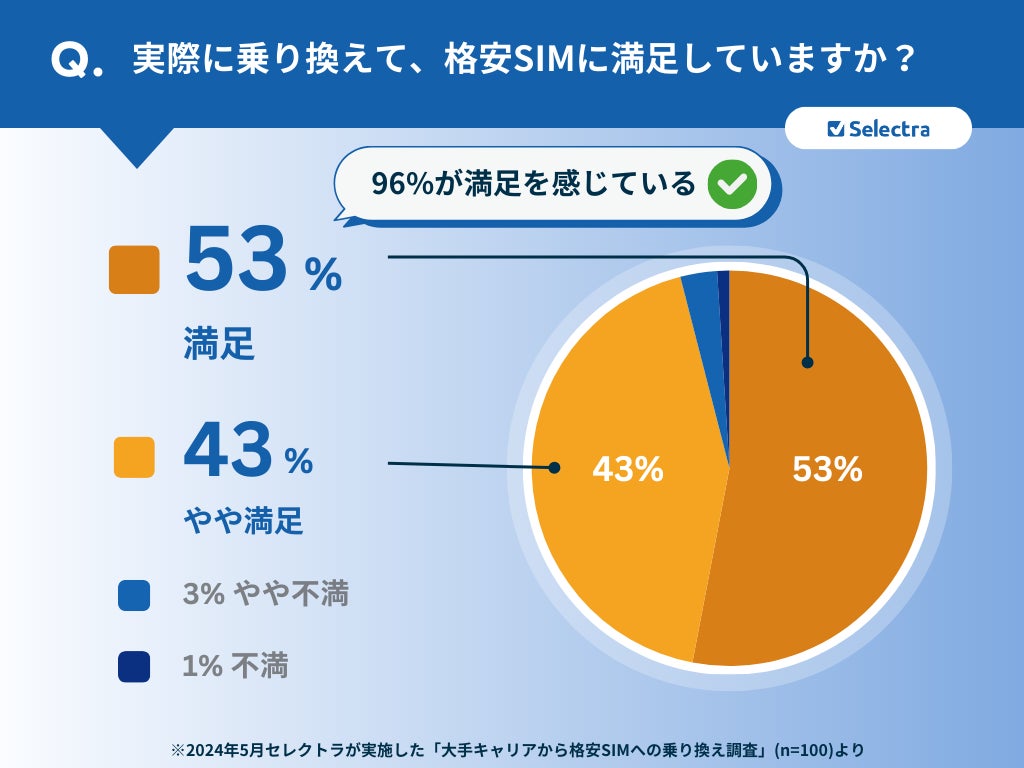 満足度への質問では、53%が「満足」、43%が「やや満足」と回答し、全体の96%が格安SIMに満足している結果となりました。