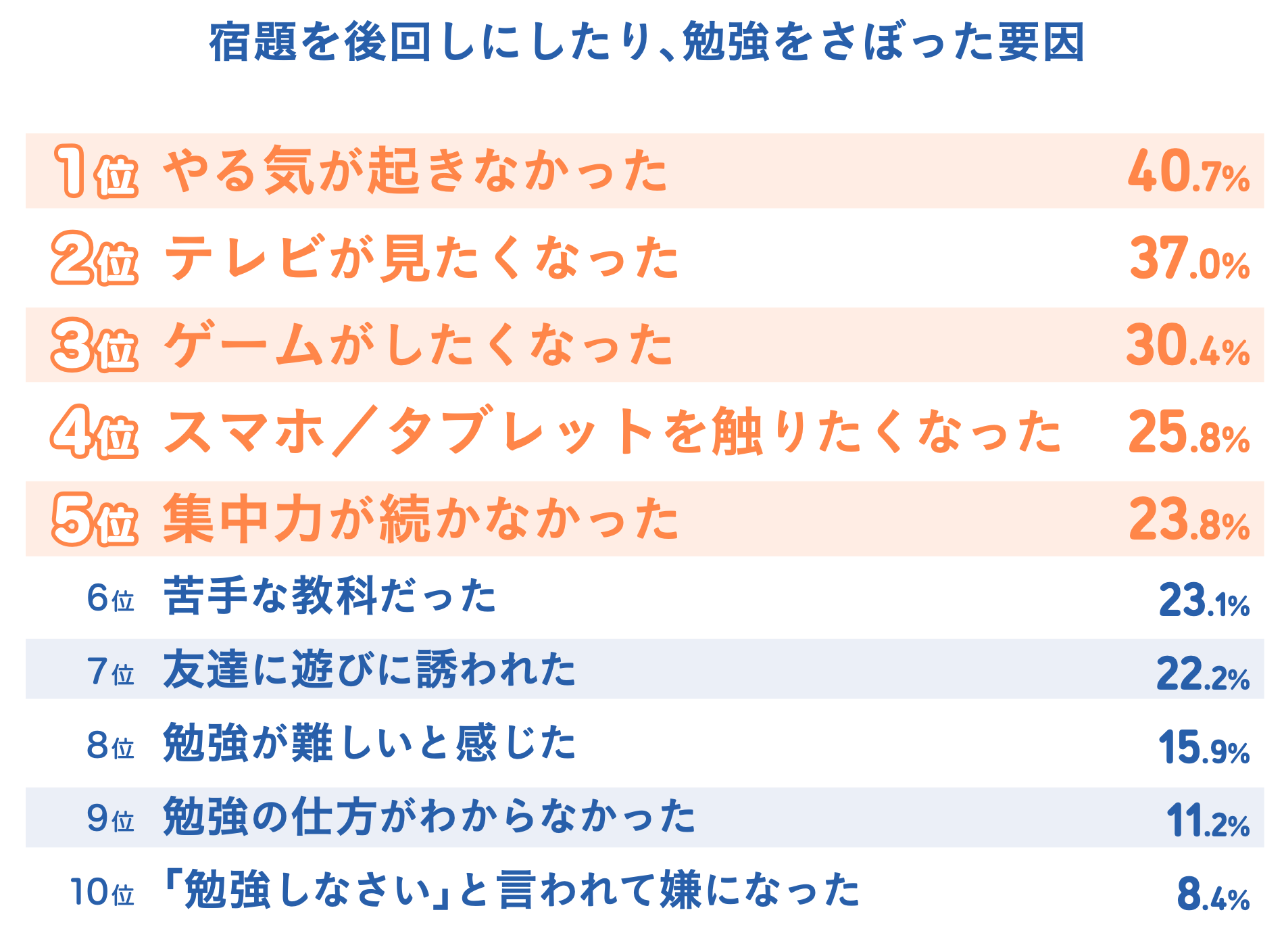 一方で子どもたちに「宿題を後回しにしたり、勉強をサボったりした経験」を聞くと、9割以上が「経験あり」と回答。その要因は「やる気」に続き、「テレビ・ゲーム・スマホ」の誘惑でした。