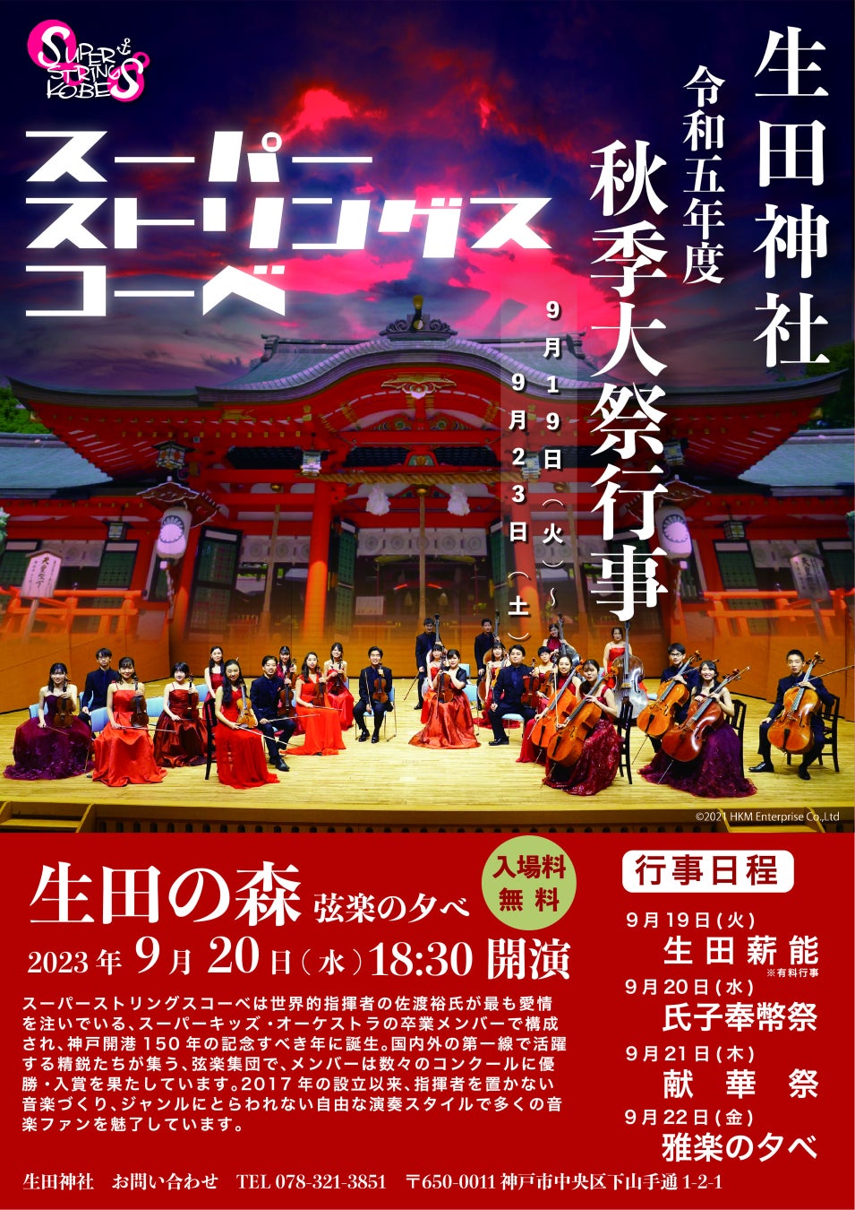 生田神社の秋季大祭行事「生田の森 弦楽の夕べ」にて、弦楽オーケストラ集団「スーパーストリングスコーベ」が演奏します。