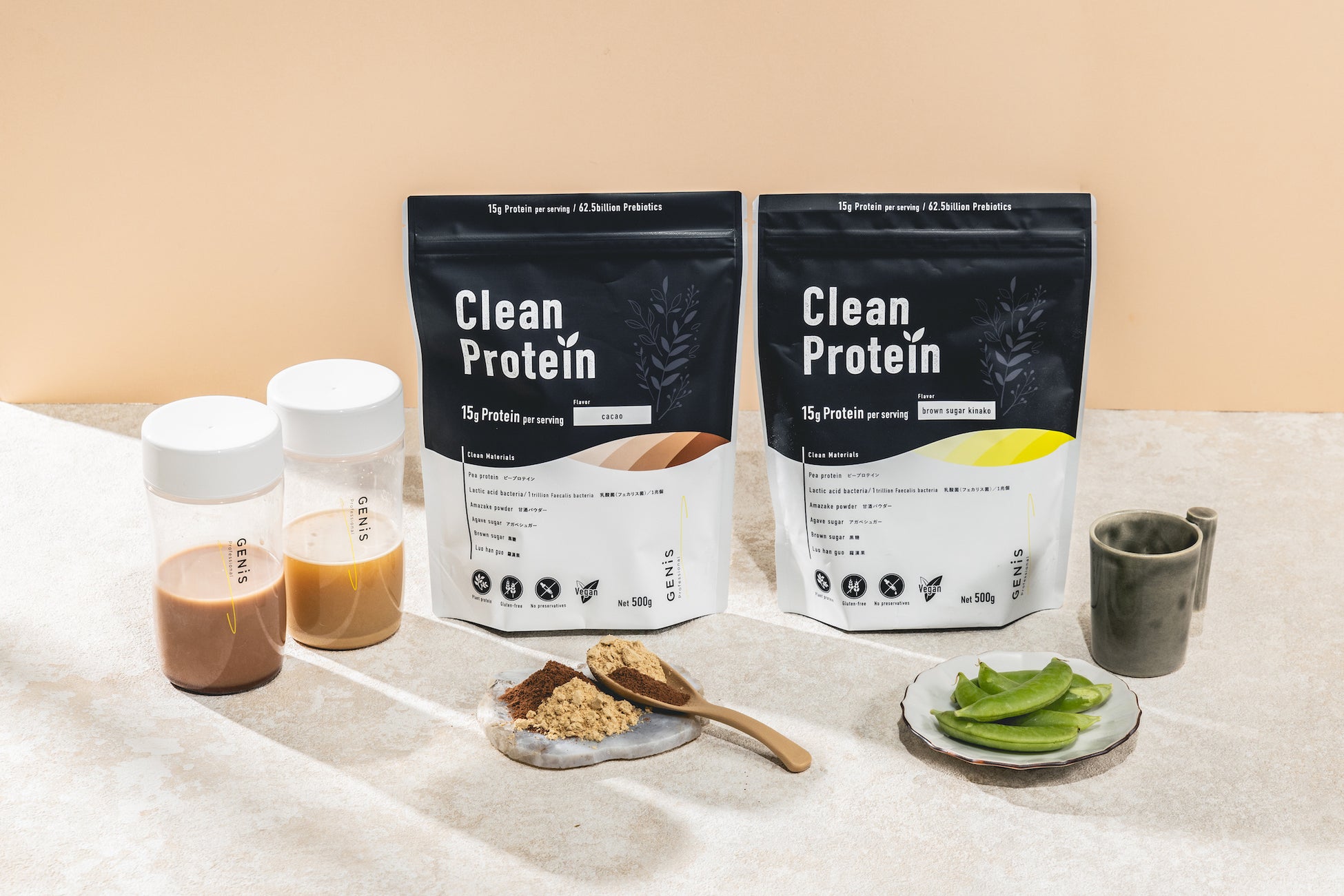 Clean Proteinは、筋肉のプロであるパーソナルジムBEYONDの⼈気トレーナー陣、さらに、オーダーメイド漢方薬専門のSEBAS.薬局を経営する薬剤師・髙城千絵子さんがGENiSと共に開発監修を行った、インナーケア・東洋医学の観点からもボディメイクを考えたプロテインです。