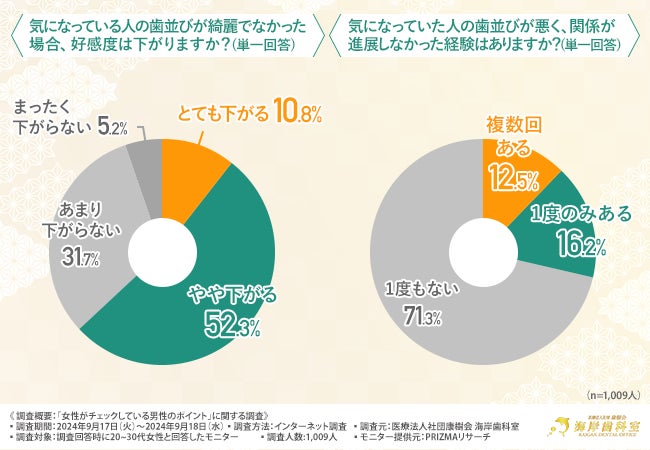 多くの女性が、恋愛関係の進展に歯並びの悪さが影響したことはないと回答しましたが、関係が進展しなかった経験がある女性も約3割いることが明らかになりました。