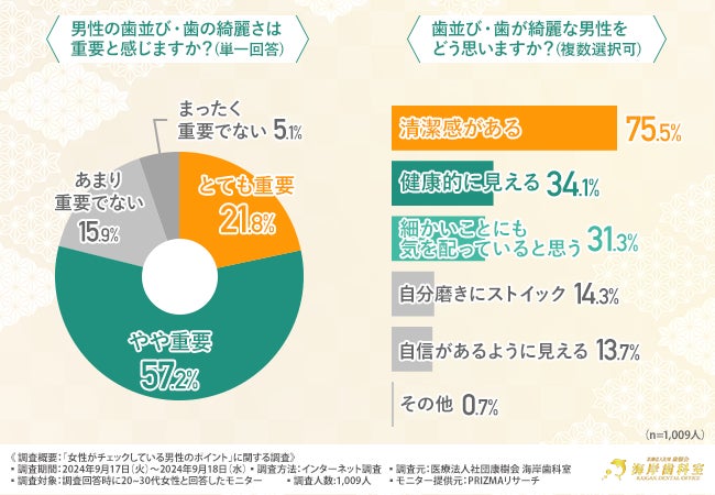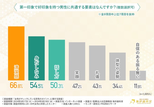 そこで今回、千葉市のインビザライン対応クリニックの『医療法人社団康樹会 海岸歯科室』(https://kaigan-do.com/)は、20~30代の女性を対象に「女性がチェックしている男性のポイント」に関する調査を実施しました。