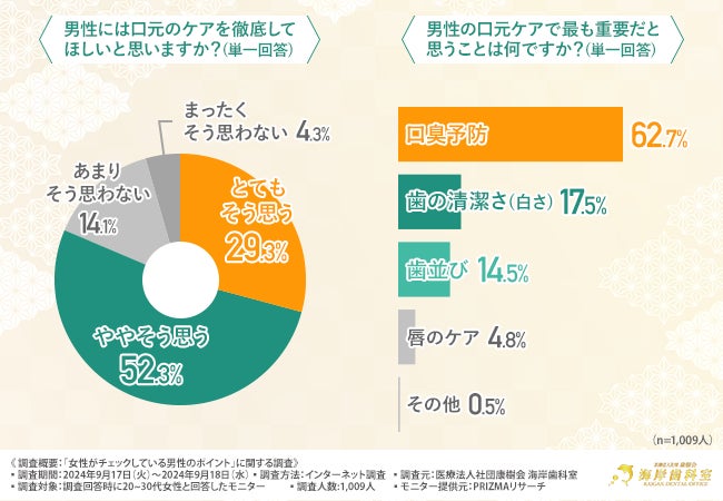 口元のケアについては、多くの女性が男性にきちんとケアしてほしいと感じており、とくに「口臭予防」を重視しているようです。
